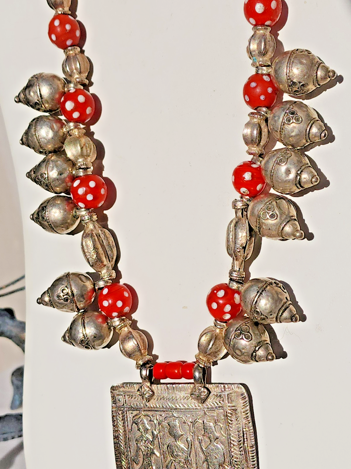This artisan necklace contains rare vintage and antique components collected by her over 65 years including the Rajasthan center amulet of silver, Yemen silver, and handmade Venetian eye beads of white core, translucent red glass with white eyes and more silver. The bulbous beads are large hole and used to be worn in the hair as fertility talismans. This is a rare, stunning, one of a kind necklace. Measuring 23-24 inches in length, this handmade antique necklace will add a unique touch of natural beauty to your outfit. And yes, it jingles. Typically ship Ground Advantage.