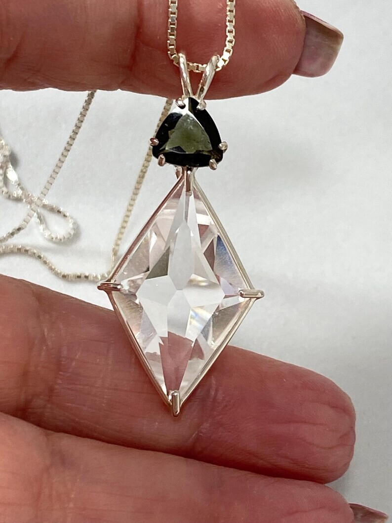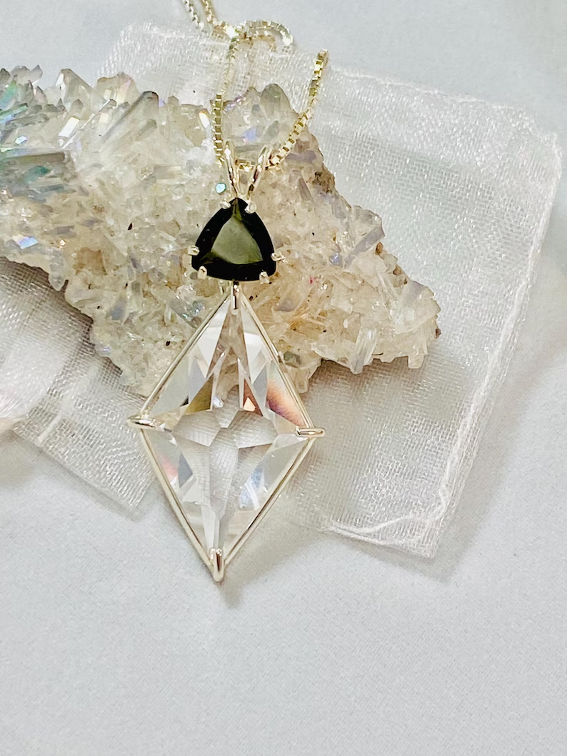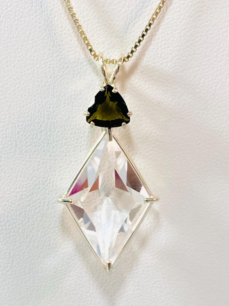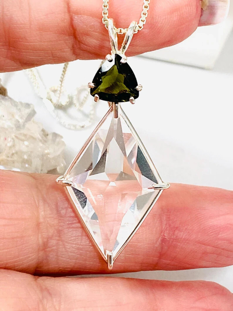 Ascension Star Clear Quartz With Trillion Cut Green Quartz Sterling Silver Pendant – Angelic Reiki Infused This high-vibrational pendant features the powerful Ascension Star cut in Clear Quartz, paired with a dazzling 8mm Trillion Cut Green Quartz , all set in 925 Sterling Silver . It comes complete with an elegant 18" fine box chain and a Lemurian Seed Crystal , energetically infused with Angelic Reiki . 🔹 Pendant Dimensions : approx. 43 mm long x 20 mm wide 🔹 Stones : Clear Quartz 24 mm( Ascension Star Cut) Green Quartz (8mm Trillion Cut) Lemurian Seed Crystal (infused) 🔹 Chain : brass Fine Box Chain Metaphysical Meaning The Ascension Star is a unique four-pointed star cut that lifts the heart through compassion and creates a powerful energetic structure for ascension. As we evolve, this pendant helps us embody and radiate divine love, wisdom, and balance — empowering us to joyfully live our soul's purpose. This cut brings the energy of the Divine into our being, assisting in manifesting the higher self and aligning with the highest spiritual guidance. It supports our conscious evolution and enhances spiritual connection. Clear Quartz energizes, heals, and balances, helping each of us find our inner light. Green Quartz promotes compassion, growth, and emotional clarity.