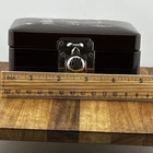 This trinket box is a stunning wooden piece with a red lacquer finish and intricate mother-of-pearl inlay. It features a red velvet lining, a mirror, and a unique turtle latch, which adds an Asian touch to its design. The rectangular shape and traditional style make it suitable for any occasion, while the vibrant red color provides a beautiful pop. This jewelry box is a perfect addition to any adult's collection, showcasing a scene of people, palm trees, birds, and water that evokes a sense of nature and elegance. It shows signs of being loved, as indicated by some wear of the lacquer sheen on the sides. Please review the included photos and email any questions you might have. While there are no returns, I am confident you will be delighted with your purchase. I encourage you to explore the other unique items in my store.