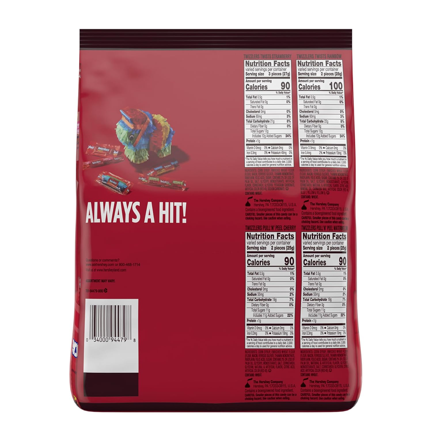 Contains one (1) 46.34-ounce bulk party pack of TWIZZLERS Assorted Flavored Chewy Candy Mix of fruit flavored chewy candies to put in birthday party favor bags, to take on your next road trip or to fill candy dishes to the brim Includes individually wrapped variety mix of TWIZZLERS Twists and TWIZZLERS PULL 'N' PEEL candies for fundraisers and concession stands Use TWIZZLERS chewy candy for graduations, back to school preparation, anniversary dates and birthday parties Enjoy a party mix of fruit flavored chewy candy that's the perfect Christmas, Valentine's Day, Easter and Halloween treat There's no party like a TWIZZLERS candy party! Seriously though, TWIZZLERS chewy candies are too fun not to enjoy with family and friends at every movie marathon, birthday party and tailgate. With a bulk party pack of TWIZZLERS assorted flavored chewy candies ready for action, you'll never find yourself without a delicious shareable snack. This party pack includes TWIZZLERS Twists strawberry flavored chewy candy, TWIZZLERS PULL 'N' PEEL cherry flavored chewy candy, TWIZZLERS Twists rainbow flavored chewy candy and TWIZZLERS PULL 'N' PEEL watermelon flavored chewy candy. Whether you're in the mood for a classic TWIZZLERS treat or want to try a new vibrant flavor, you'll be set with this assortment party pack. Keep your pantry stocked with kosher certified, licorice style TWIZZLERS chewy candies, store some in your work desk or take a bag on a road trip or to your next party gathering. Looking for an even greater adventure? For a unique twist, melt several white creme or milk chocolate bars, dip your TWIZZLERS candies in the melted gooeyness, then cover each piece in sprinkles and let the new treats cool! They even make scrumptious holiday treats for Christmas stocking stuffers, Halloween trick-or-treat bags, Easter baskets and Valentine's Day presents.