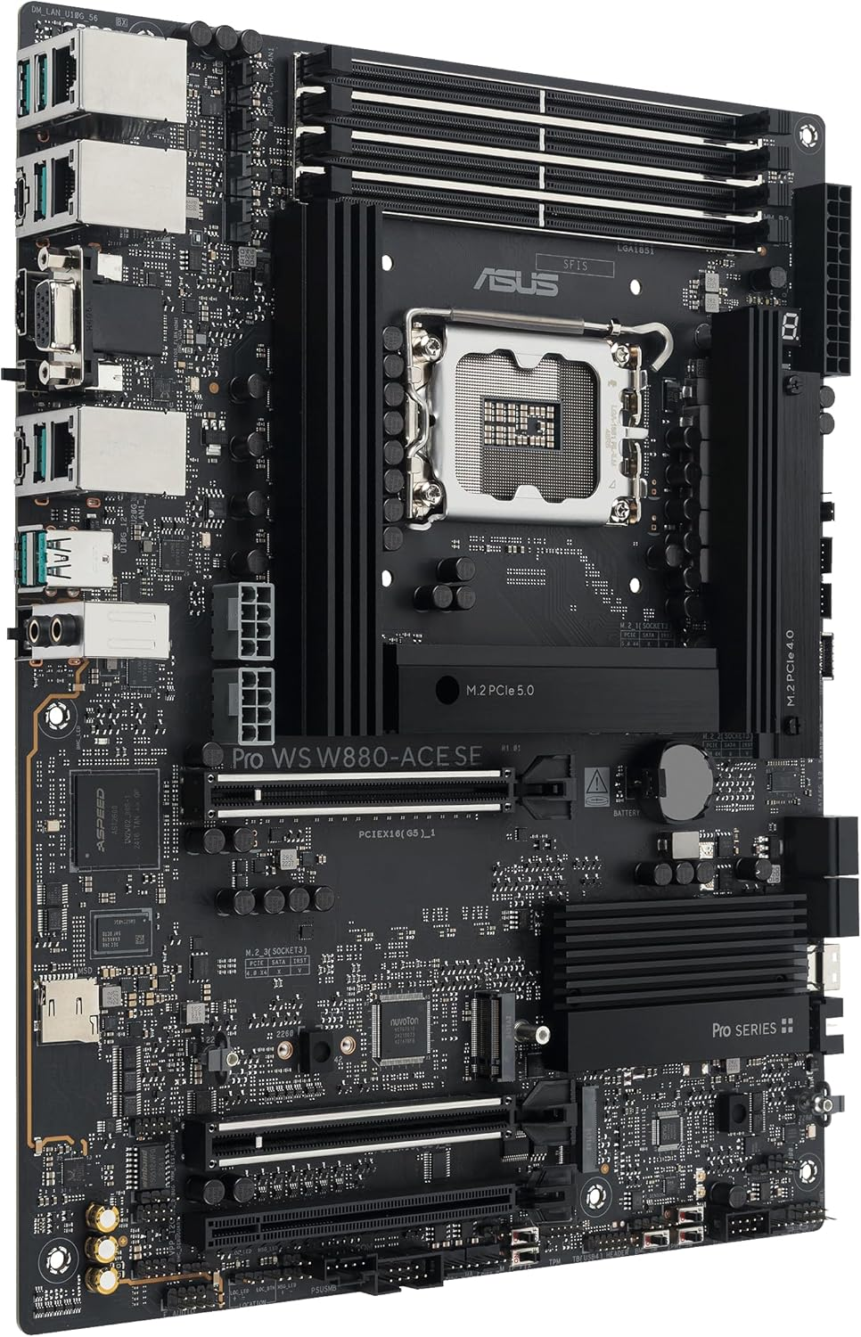 ASUS Pro WS W880-ACE SE Intel® Core™ Ultra Processor (Series 2) LGA 1851 ATX Motherboard, 8+1+2+2 Power Stages, PCIe® 5.0 Ready for Next-gen GPUs, DDR5, Thunderbolt™ 4 Type-C®, 2X 2.5 GbE LAN, 4X M.2 Brand ASUS CPU Socket LGA 1851 Compatible Devices Personal Computer RAM Memory Technology DDR5 Compatible Processors Supports Intel® Core™ Ultra Processors (Series 2) , LGA1851, Supports Intel® Turbo Boost Technology 2.0 and Intel® Turbo Boost Max Technology 3.0 Supports Intel® Core™ Ultra Processors (Series 2) , LGA1851, Supports Intel® Turbo Boost Technology 2.0 and Intel® Turbo Boost Max Technology 3.0 Chipset Type Intel W880 Memory Clock Speed 9066 MHz Platform Windows 10, Windows 11 Model Name Pro WS W880-ACE SE CPU Model About this item Ready for advanced AI PCs: Designed for the future of AI computing, with the power and connectivity needed for demanding AI applications Intel LGA1851 socket: Ready for Intel Core Ultra 9, 7, and 5 desktop processors Robust performance: 8+1+2+2 teamed power stages, ProCool II power connectors, high-quality alloy chokes and durable capacitors Future-proofed connectivity: 1 x Thunderbolt 4 ports, dual 2.5 Gb Ethernet, two PCIe 5.0 with full support for next-gen GPU, and one PCIE 5.0, three PCIe 4.0 M.2 slots and a USB 20Gbps front-panel header Exclusive AI and overclocking technologies: AI Cooling II, AI Advisor, and NPU boost DIY-friendly design: SafeSlot, M.2 Q-Latch, BIOS FlashBack, Q-Connector, Q-CODE Server-grade IPMI remote management: Hardware and software-level with a dedicated LAN port link to AST2600 BMC controller, plus a real-time monitoring and management software – ASUS Control Center Express. TUV GREEN MARK Certification Windows 11 (22H2 & later), Windows 10 64-bit(21H2 & later) From the brand ASUS ProArt Collection Previous page ProArt Motherboards Visit the Store ProArt Graphics Cards Visit the Store Intel Core Ultra 5