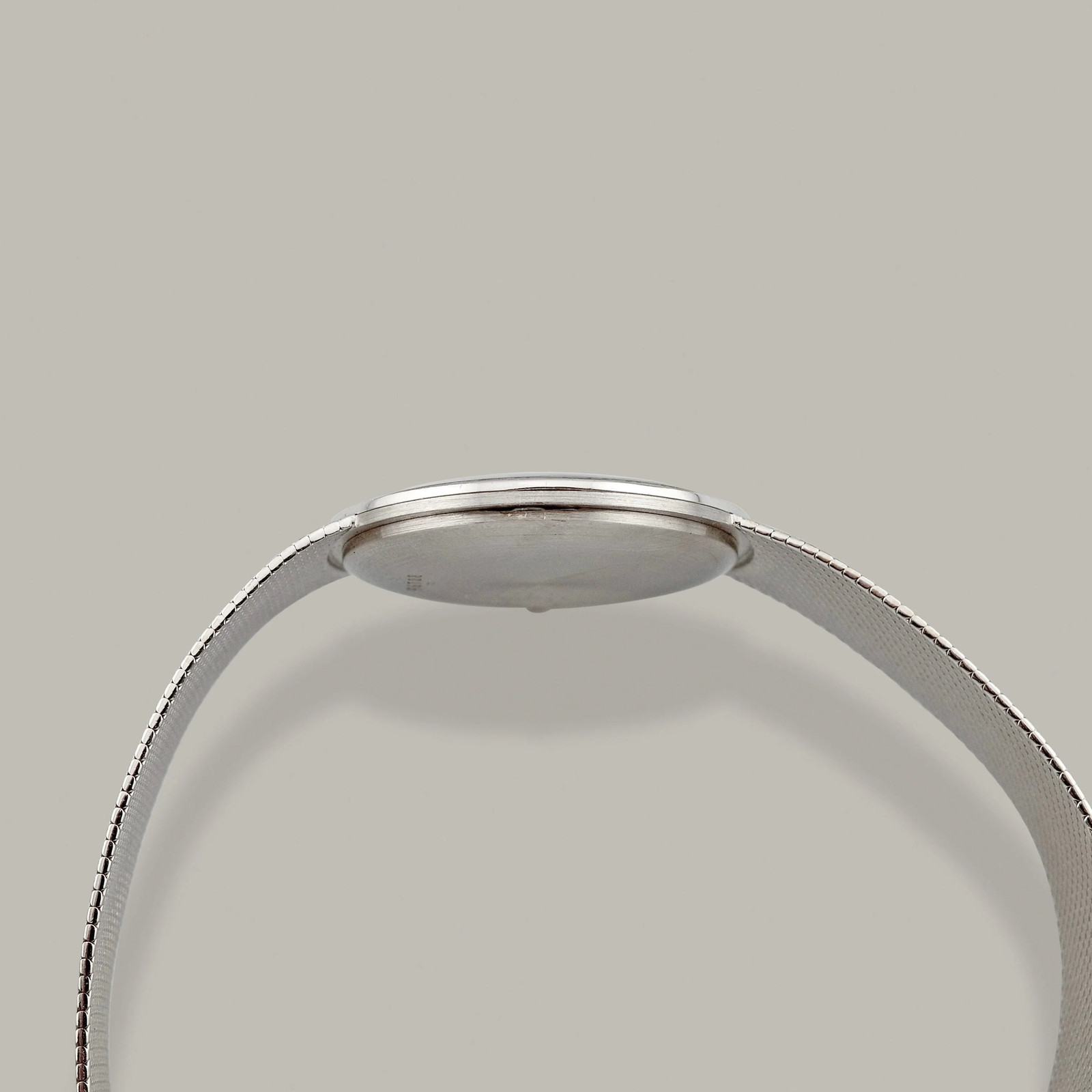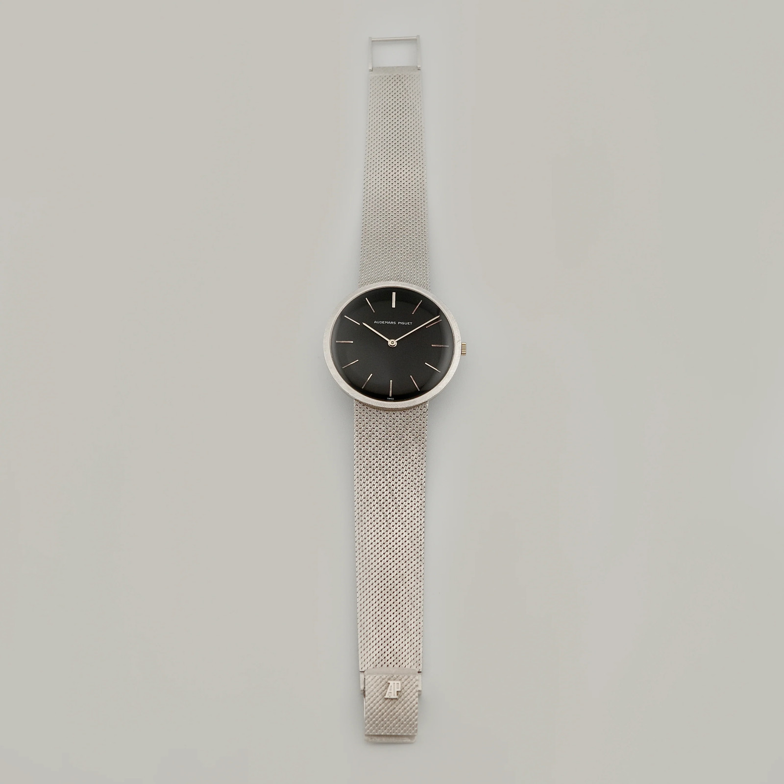 Our Perspective: If you only think about Royal Oaks or Offshores when you hear Audemars Piguet, then you're missing out on some amazing vintage watches. This watch was produced in the 1970s and features a solid 18K white gold case, a perfectly-preserved rare black dial and and the thin manual-winding AP Cal. K2001/1A. The value for the price of vintage Audemars Piguet dress watches is unbeatable, and unfortunately there hasn't been any watch even remotely similar to this design language in Audemars Piguet's catalog in decades. It's a minimalist watch that is strong in details, like it's uncommon cross-hatch Florentine-style finished bezel, pencil hands and woven integrated bracelet. This example is slightly more interesting than most because if you take a look at the movement bridge, you will see "AUDEMARS PIGUFT" engraved. Maybe it was close to lunch time in the 1970s for this engraver, but even with the more relaxed quality control of that era, a typo like this is extremely uncommon for Audemars Piguet. Mistakes of this kind almost never left the factory, which makes this piece a quirky and genuinely rare slice of AP history that gets a shock from the most seasoned AP collectors. This exact watch was sold through highly-reputable vintage dealers that did not catch this error prior to it being in our hands, and there is no question about the authenticity of this piece. Condition Report: Very Good overall condition. Case and bracelet are in impressive vintage condition and appear to be unpolished. Bezel and bracelet texture is visible and strong. Medium scratches and indentations throughout case and bracelet, more noticeable on the side of the case from the caseback being opened & caseback from normal wear. Faint scratches at crystal. Dial is in extremely well-preserved condition with no signs of refinishing, significant flaws or damage. Light patina on some indices. Crisp hallmarks visible on buckle and caseback. Movement is clean and winds, sets and runs without issues and runs at a great 5-position average of -2.8 S/D | 0.1MS BE | 261 Degree Amplitude. Watch has a 2 position adjustable closure and fits a max wrist size between 6.75-7 Inches. Condition Grade: 8.5 /10