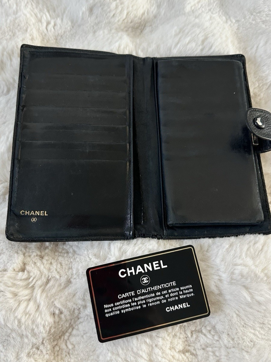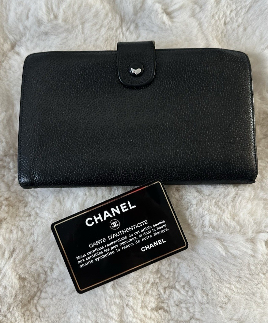 Elevate your everyday style with this authentic Chanel wallet crafted in iconic black caviar leather featuring the classic CC logo. A timeless investment piece that blends luxury and functionality. Pre-owned. Please see all photos