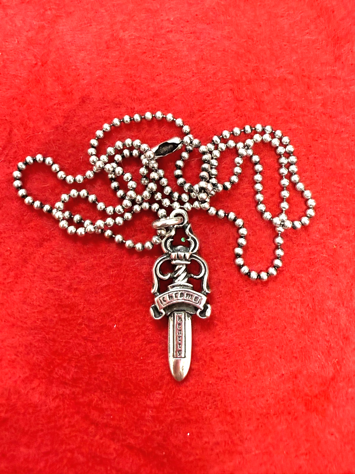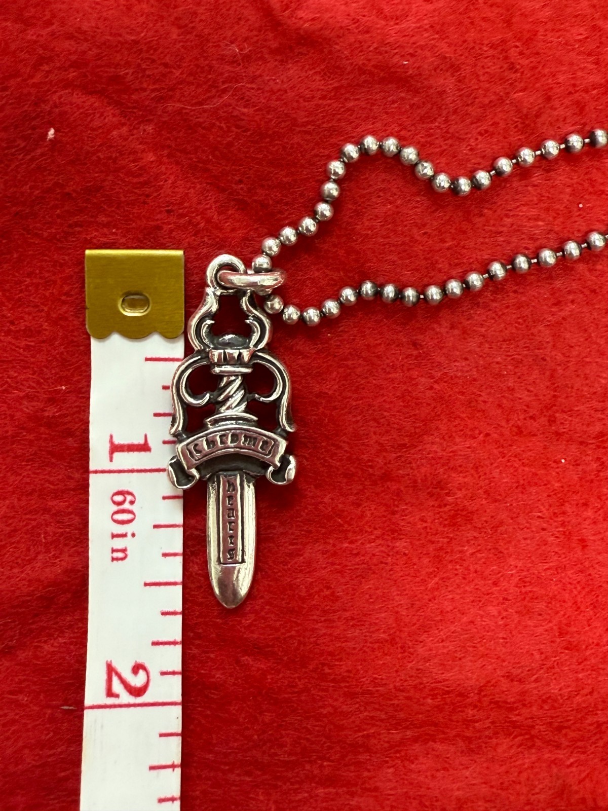 The Authentic Chrome Hearts Antique Dagger Pendant with Ball Chain is a striking piece of jewelry that exudes a Gothic theme. This pendant features a dagger shape, making it a unique and edgy accessory for occasions like Christmas, graduation, anniversaries, birthdays, or confirmation/communion. Crafted from silver with engraved details, this vintage piece is signed by the brand Chrome Hearts and is sure to make a statement with its distinctive design and charm. The pendant comes with a 22-inch ball chain closure, adding a touch of sophistication to any outfit.