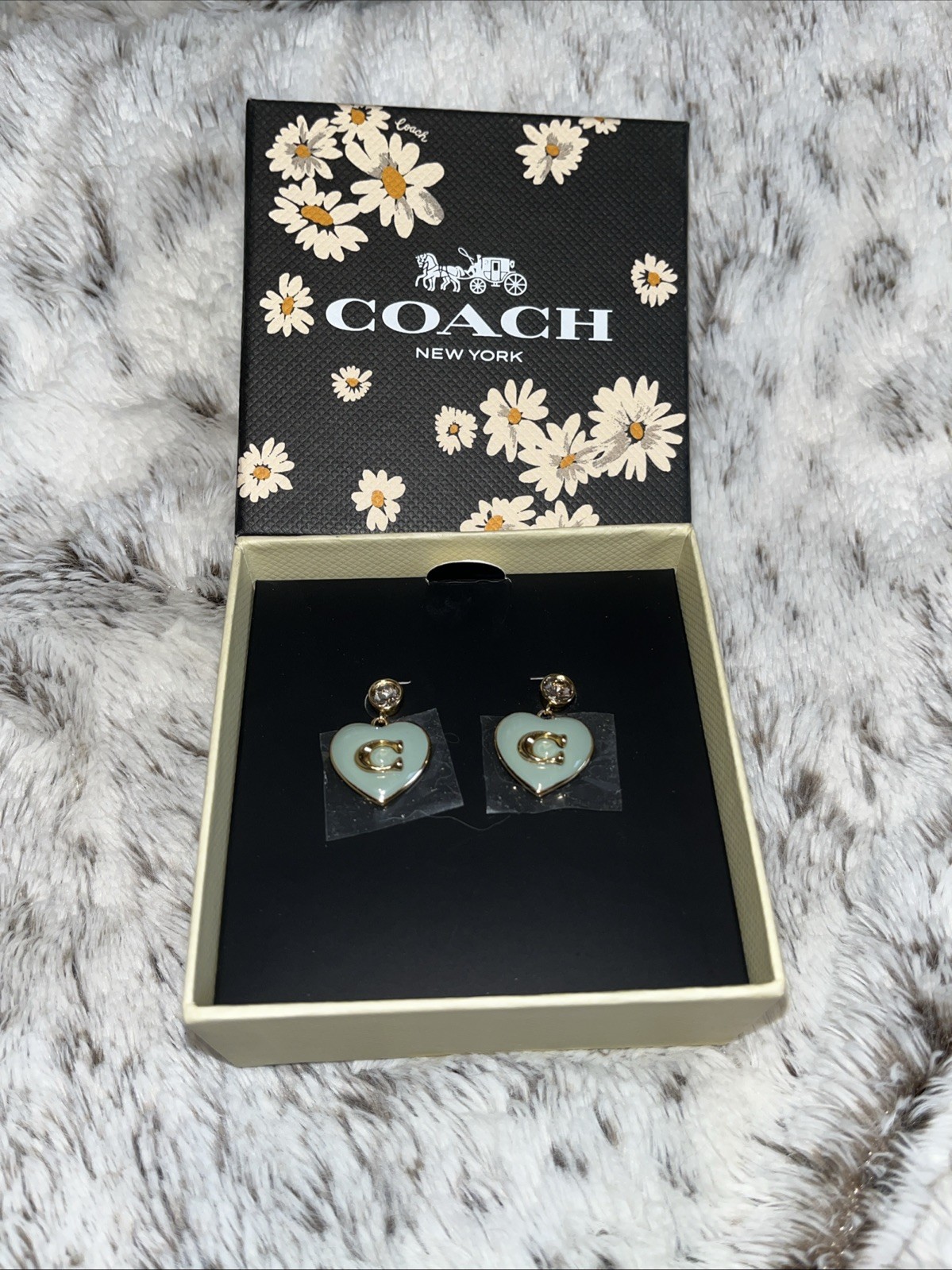 Authentic Coach Light Blue/Greenish Enamel Heart Earrings with C Logo. Brass/Gold New with Box. Purchased at Coach.
