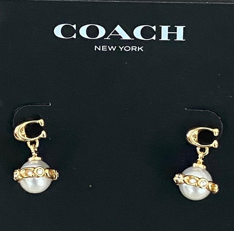 New Authentic COACH Signature Pearl Drop Earrings These luminous glass pearl drop earrings are detailed with our Signature for heritage style. Dangling from our Signature stud, the delicate pair is finished with a round clutch closure. Style Number CBB04 Measurements Height: 0.25" Width: 0.25" Materials Plated brass, glass and cubic zirconia Hypoallergenic titanium post Features Round clutch closure