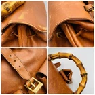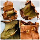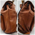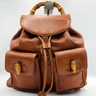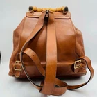 The Authentic Gucci Bamboo Backpack is a vintage y2k bag crafted from brown leather with a solid pattern, featuring turnlock closure and gold hardware accents. The medium-sized backpack boasts a unique combination of brown leather and bamboo handles/straps, adding a touch of luxury to its design. With a classic backpack style and multiple pockets for convenience, this Italian-made Gucci bag is perfect for the fashion-forward woman looking for a statement accessory for her wardrobe.