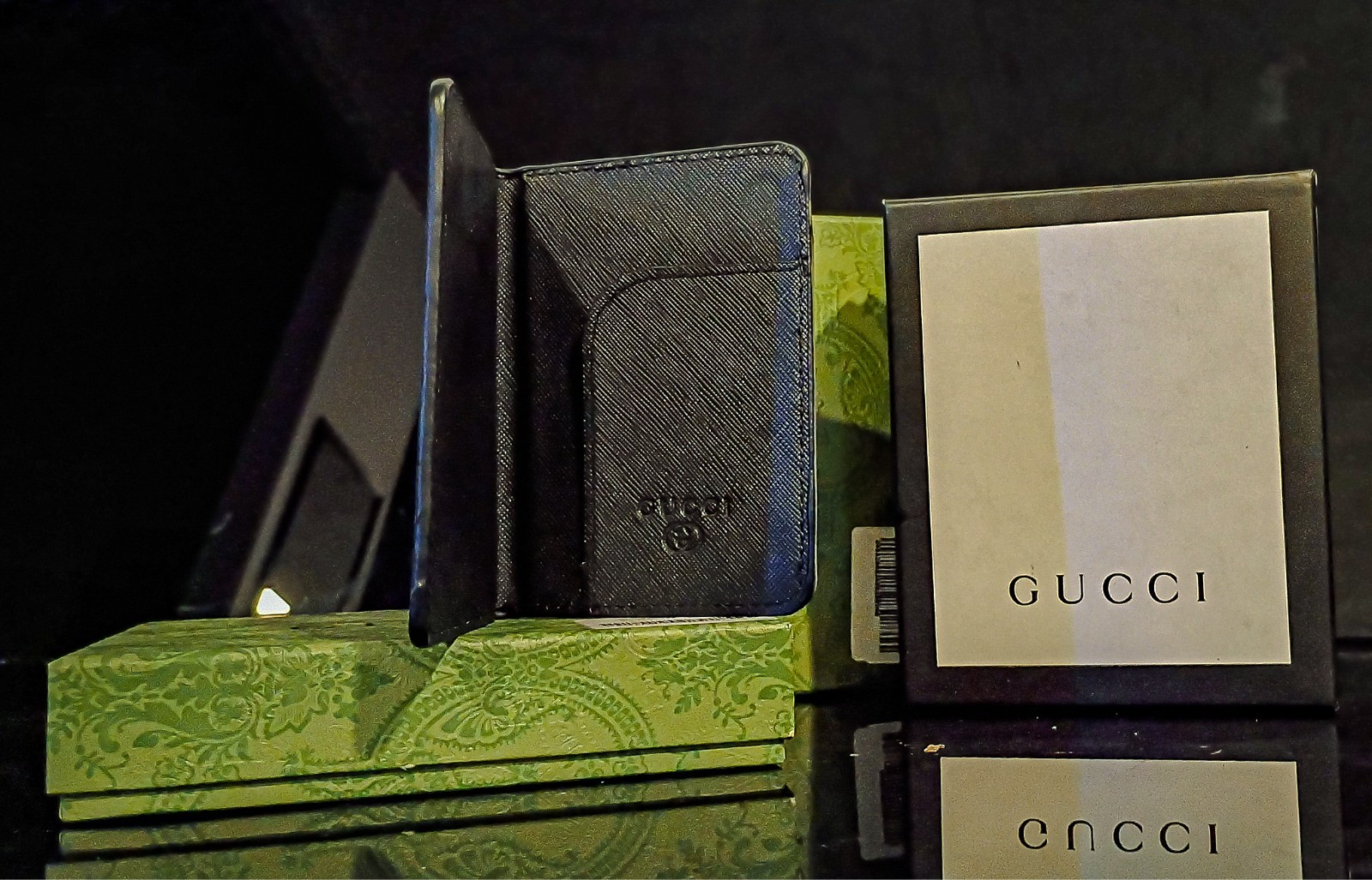 Discover the elegance of the brand new Gucci Microguccissima Black Leather Card Holder. Featuring the iconic GG Emblem, this sleek, magnetic card holder beautifully reinterprets Gucci's rich heritage of craftsmanship and style. Crafted from smooth embossed leather with the signature GG motif, this unisex accessory is part of Gucci's latest high-fashion collection. Perfect for both men and women, this bifold card case is brand new, complete with UPC tags, and available from Gucci’s Miami District boutique.