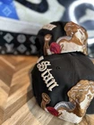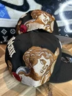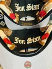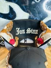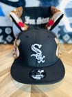 This is an Authentic Jon Stan X New Era Hat Club Chicago White Sox Black SnapBack Angels hat for men. It features a solid black color with a unique design collaboration between Jon Stan and New Era. The hat is a one size fits all and made of 100% polyester fabric. The design includes elements from Hat Club, Chicago White Sox, and Angels, making it a rare and sought-after piece for hat collectors.