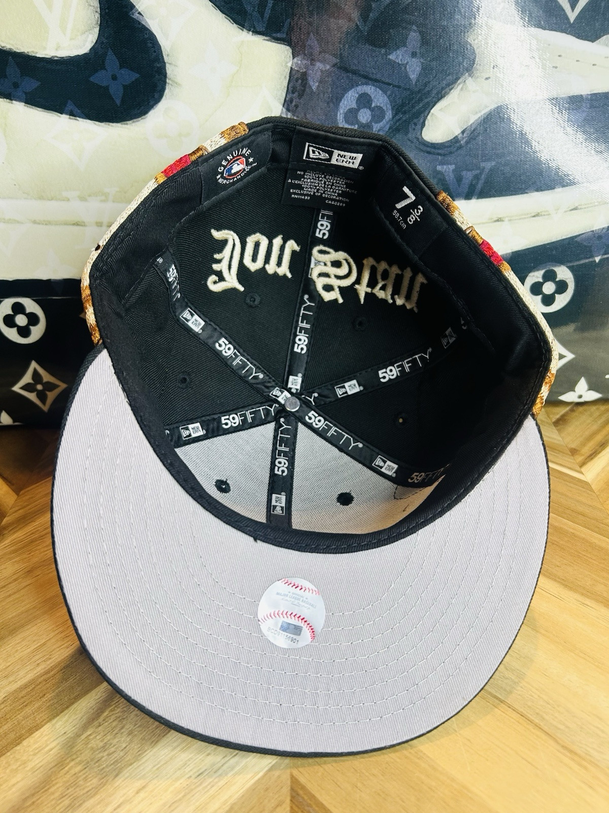This is an authentic New Era Jon Stan Chicago White Sox Black Angels fitted cap in size 7 3/8. It features a solid black color with an upside-down logo design. The hat is made of 100% polyester fabric and is part of the Concepts and Supreme themes, making it a rare and sold out item. It is ideal for men to wear on various occasions.