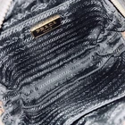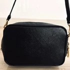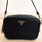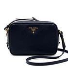 H9cm (3.54 in) W14cm (5.51 in) D5cm (1.97 in) Shoulder or handle 110cm (43.31 in) The Authentic PRADA Camera Bag is a rare and stylish crossbody shoulder bag made of black Saffiano leather. This mini tote bag features a zip closure, gold hardware accents, and a black nylon and leather crossbody strap for convenience and versatility. Perfect for business occasions, this designer bag exudes luxury and sophistication. Made in Italy, this PRADA bag is a must-have for any fashion-forward woman looking to add a touch of elegance to her outfit.