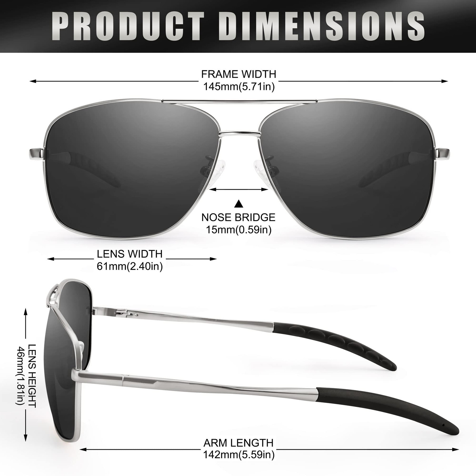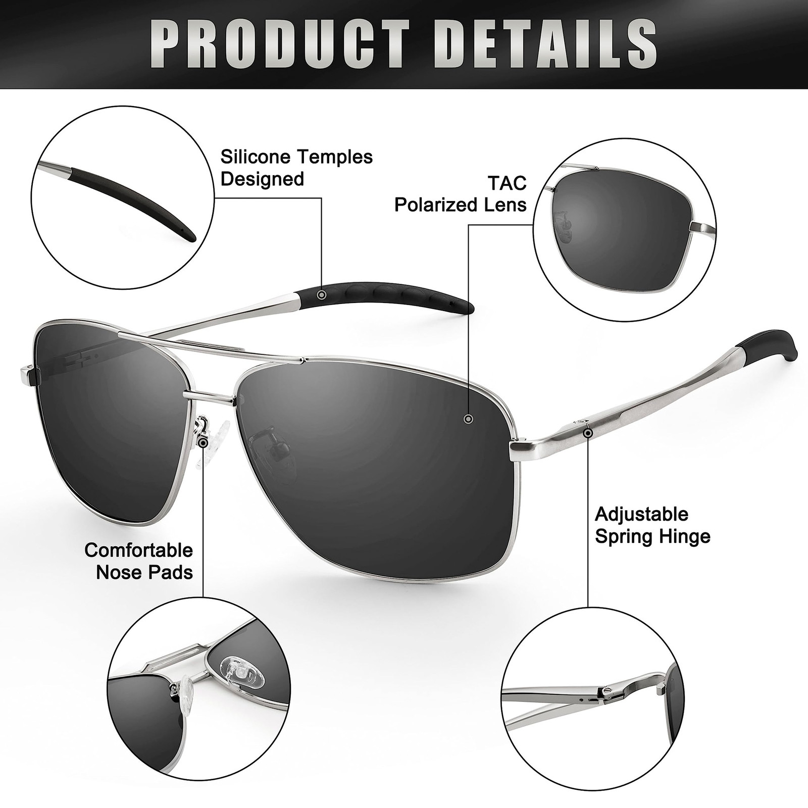 HD POLARIZED LENS:polarized lens can filter out sunlight reflection glares effectively and restore you an ultra-clear world with real color. UV400 protection coating keeps your eyes fully protected against harmful UVA and UVB rays FULL METAL FRAME:Classic polarized pilot shape sunglasses are crafted from lightweight and strong metal material frames and give you prolonged and high-frequency use, ideal for driving, cycling, fishing, climbing, or other outdoor activities FLEXIBLE SPRING HINGE:Unique spring-loaded hinged legs provide great flexibility and allow glasses arms to extend beyond the traditional 30° range of motion to adapt to different face styles and head sizes, making every wearing with minimize pressure ADJUSTABLE NOSE PADS:Our smooth nose pads made of skin-friendly air chamber silicone will give you a comfortable wearing feel. Adjustable design adapts to different nose types and makes sure these mens aviator sunglasses sit snugly on your face SILICONE RUBBER EARPIECE:Strong yet lightweight design, No chemical smell. The rubber temple sleeve on these square aviator sunglasses will not cause any discomfort. They are great for wearing all day, on the beach, at a party, or in the street