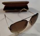 These are gold framed vintage metal sunglasses. Lenses are screwed to the frame Only words I can find on them is just "TAIWAN" Some corrosion? Above left lense (pictured) Case is vintage and nice but doesn't stay latched I believe you'd call the lenses rose tinted but I'm by no means an expert. Please ask questions before bidding thank you!