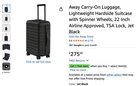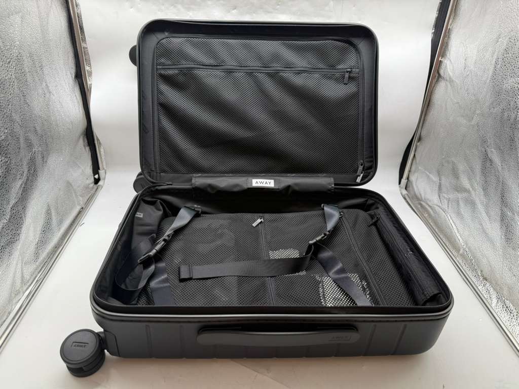 This listing is for an Away Carry-On Hardside Suitcase , a premium, airline-approved carry-on designed for durability, smooth travel, and smart organization. Item is open box and appears unused or lightly handled . It was opened for inspection only. Please review all photos for exact condition. Key Features π§³ 22β carry-on size β airline approved π 360Β° spinner wheels for smooth rolling π Built-in TSA-approved combination lock π§± Durable lightweight hardside shell π§Ί Interior compression system & zippered compartments βοΈ Ideal for business, weekend trips, and frequent travelers Specifications Brand: Away Model: Carry-On Size: 22 inches Color: Jet Black Shell Type: Hardside Wheels: 4 spinner wheels Lock: TSA-approved combination lock Handle: Telescoping pull handle Condition Details (Please Read) Open box item Suitcase appears unused Wheels roll smoothly Zippers, lock, and handle function properly Box shows storage/shipping wear No cracks or damage noted Whatβs Included β Away Carry-On suitcase β Interior dividers & compression straps β Original Away box (open, worn) Shipping Ships securely in original box with additional protection.
