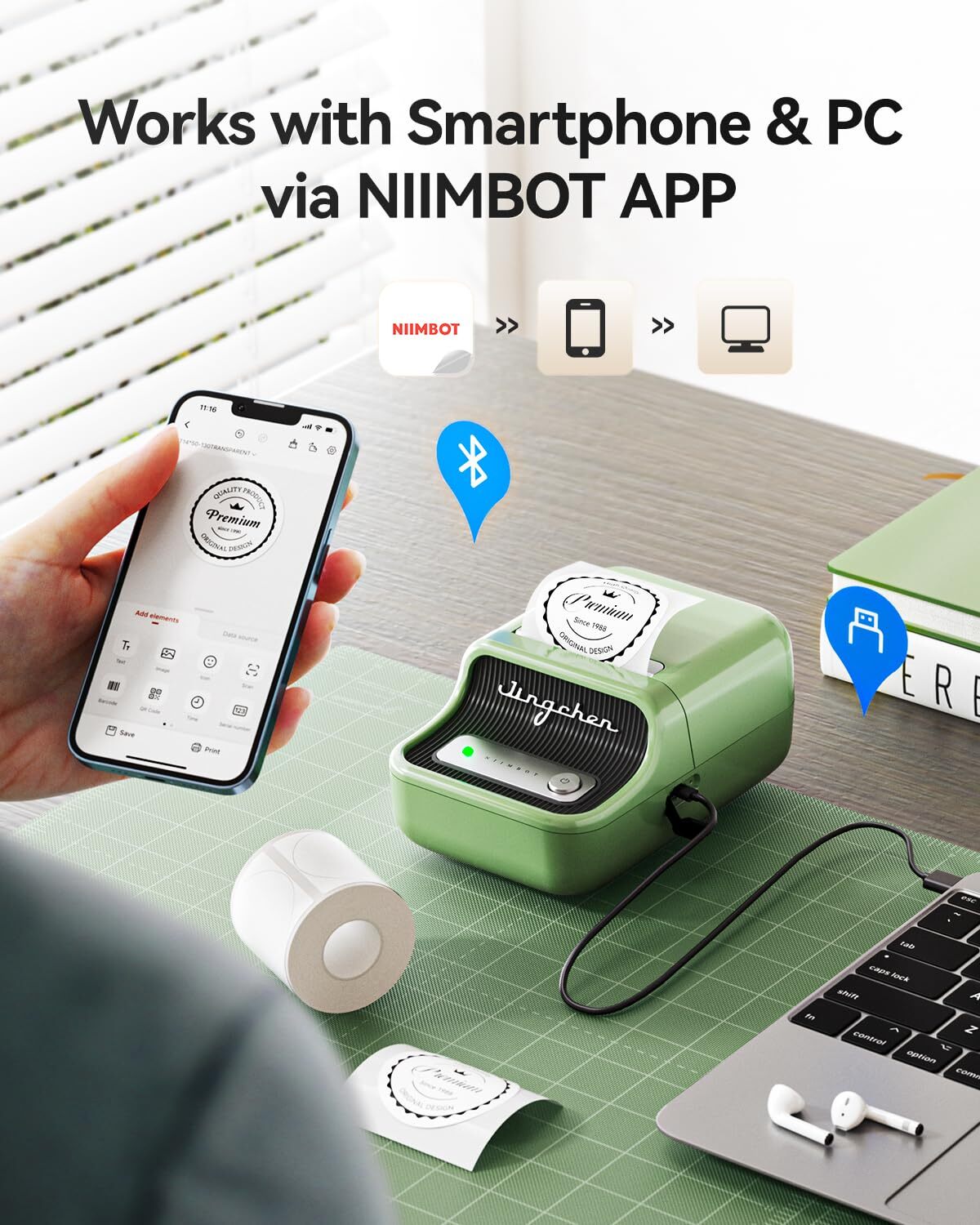 【Inkless Label Maker】 B21 label printer label width range of is 20mm-50mm(0.8-2 inch).The effective printable width is 48mm. This B21 label maker machine comes with 1 pack of 50x30mm labels (230pcs/Roll) to use. 【Fast Printing & Save Money】With the automatic label identification and label automatic alignment, B21 label maker makes your printing more fast and more effective. Because of thermal printing, no need to use ribbon or toner, reduce consumable demand and save money. 【Easy to Use】B21 Bluetooth label printer is not only compatible with iOS & Android smartphone,but also compatible with PC, for PC use,it needs to download the driver from the official web.(Not compatible with Pad, not recommended for use with Pad.) 【DIY Your Own Label】The app included more than support 30+ fonts/Languages, 100+ borders, and 1500+ symbols,excel, QR code, OCR print etc... Just need to download the free app, choosing and connecting printer model B21 from APP, Then Enjoy Printing. 【1500mAh Battery Capacity】With 1500 mAh lithium battery for convenient & lasting printing. 4 hours lasts working after one charge. Made of high quality material with retro style, this label maker can be widely used in home storage, wedding, party, clothing, bakery, jewellery, small business, school, home office.And this label maker also is a nice choice as present for Birthday, Anniversary, Housewarming, Christmas, Halloween, Thanksgiving, Mother's Day.