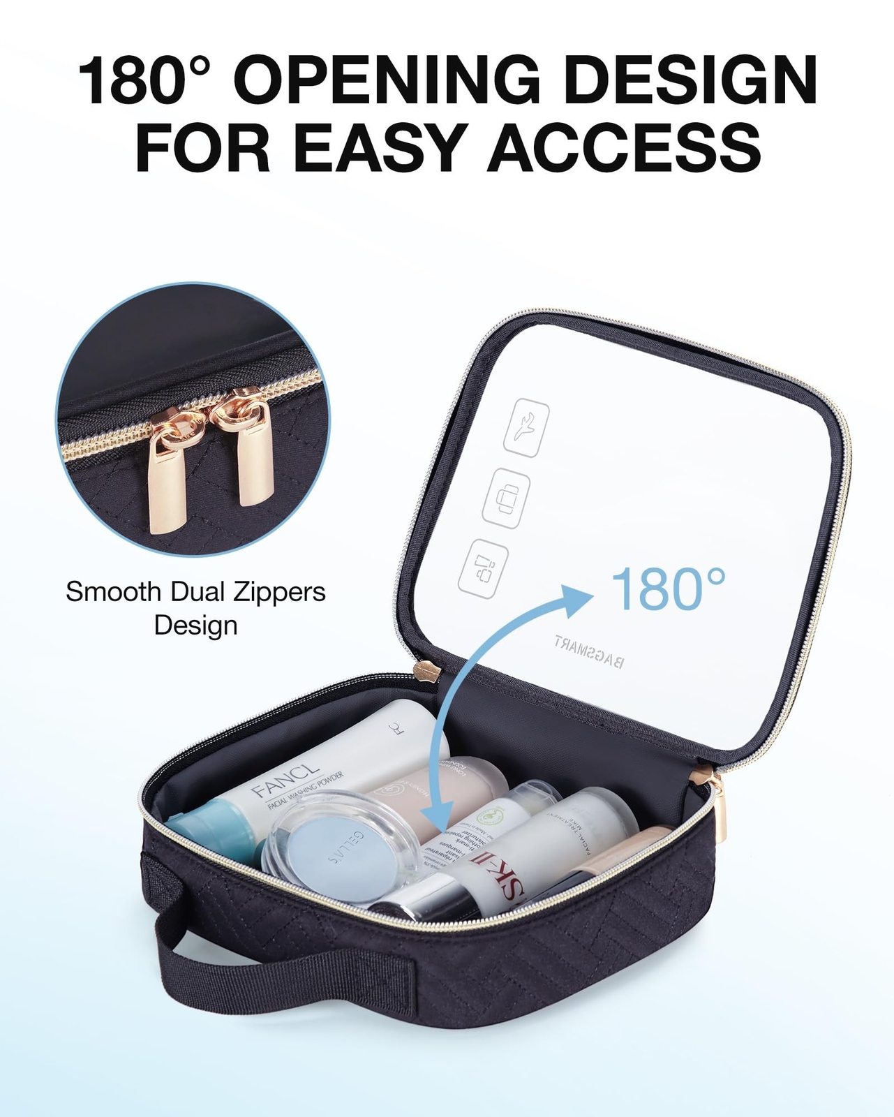 BAGSMART Clear Makeup Bags, 2 Pack TSA Approved Toiletry Bag with Handle Large Opening, Cosmetic Bag Organizer, Quart Size Travel Bag for Toiletries, Carry-on Travel Accessories Essentials,Black-2pcs Product Details Size: 2 Pack, Medium Color: Black-Fully open Brand: BAGSMART MPN: BM0108057 UPC: Does not apply EAN: Does not apply Product Dimensions: 9.06 x 7.48 x 1.77 inches Item Weight: 4.8 ounces Department: Women Manufacturer: SIRI US Country of Origin: China Item model number: BM0108057 STYLISH APPEARANCE: Clear makeup bag is made with a stylish peachskin back and odorless TPU for a clear view and great durability. It is clear and easy to wipe clean, allowing for quick visibility and access. 180 OPENING DESIGN: Cosmetic bag double zippers can open up to 180, enabling the clear bag to be easily flipped open horizontally, providing convenient access to travel essentials. The durable handle design allows for easy lifting and hanging of this clear bag. TSA 3-1-1 APPROVED: TSA approved toiletry bag are fully compliant with TSA 3-1-1 rules and regulations of all airlines and get through the airport security easily and fast. VERSATILE FEATURES: Travel makeup bag size is 8.3''L x 2.6''Wx 6''H. And the equipped with double way metal zippers provide easy portability and quick access to items. TRAVEL ACCESSORIES: Bagsmart toiletry bag can be a cosmetic bag, toiletry bag, grocery bag, toy bag, medicine bag, skincare bag, electronics bag, stationery bag, storage bag, etc.