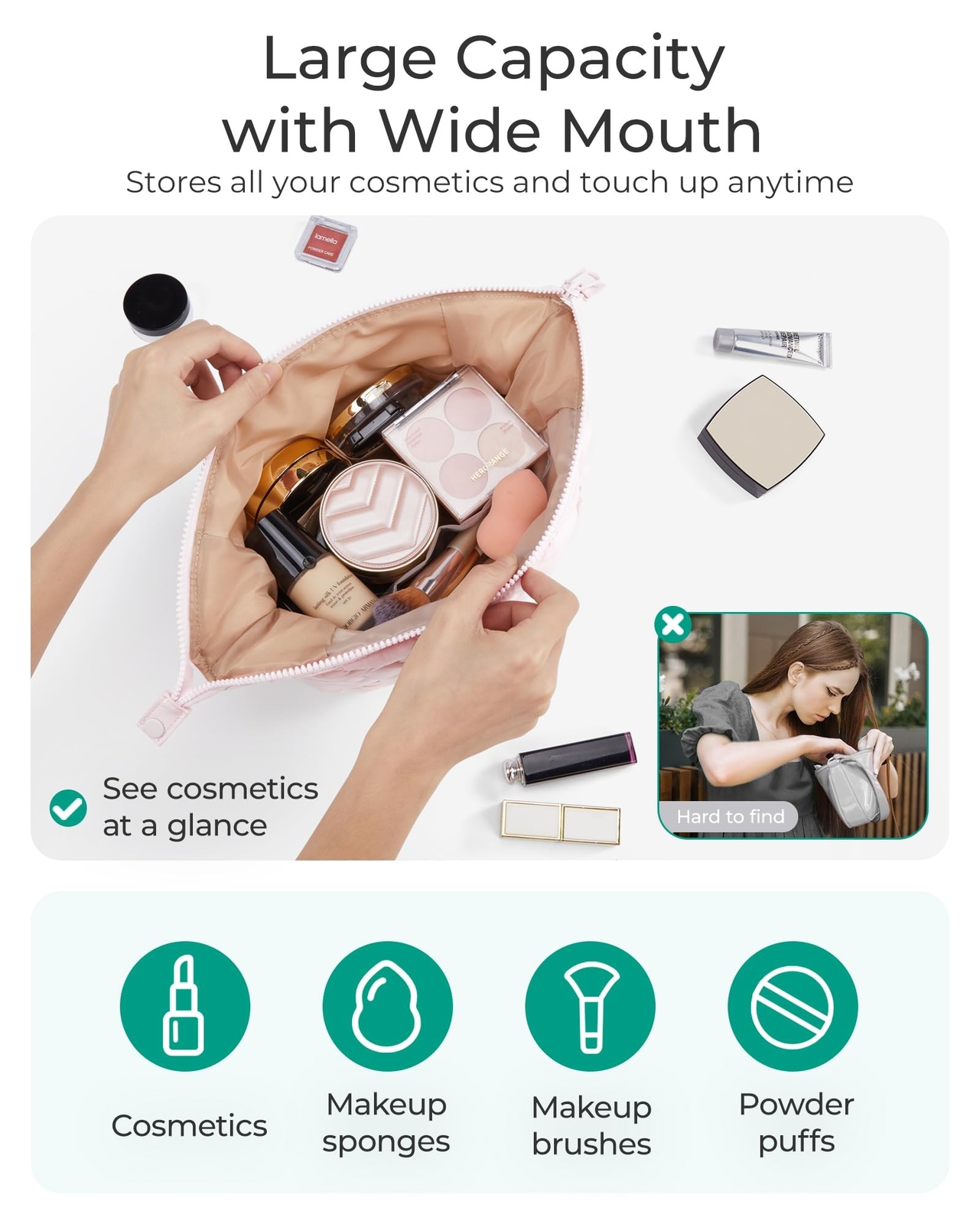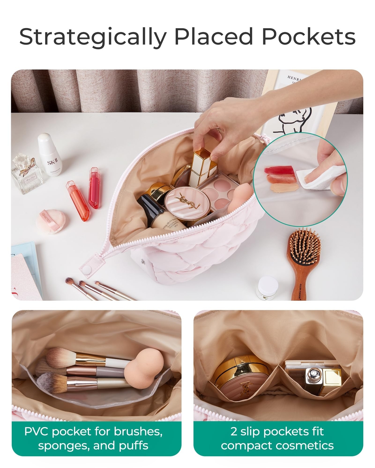 BAGSMART Quilted Travel Makeup Bag, Puffy Toiletry Organizer with Wide Opening, Cosmetic Storage for Women's Accessories, Pink Product Details Color: Pink Brand: BAGSMART MPN: makeup bag UPC: Does not apply EAN: Does not apply Product Dimensions: 14.2 x 6.7 x 3.9 inches Item Weight: 1.76 ounces Department: Unisex Adult Manufacturer: BAGSMART Country of Origin: China Item model number: makeup bag Fluffy Quilting Design: Elevate your beauty routine with our makeup bag, crafted with a delightful fluffy quilting design. This unique texture not only adds a touch of elegance but also ensures that your cosmetics are cushioned and protected wherever you go Generous Storage Space: With dimensions of 14.2 x 3.9 x 6.7 inches, this cosmetic bag offers ample space for all your beauty essentials. Featuring three practical pockets, you can easily organize your lipsticks, eyeliners, and makeup brushes, making it the perfect companion for travel or everyday use Easy-To-Clean Interior: Say goodbye to messy spills! Our make up bag includes specially designed pockets with PVC lining that keep your brushes and beauty products safe and easy to clean. Effortlessly maintain your makeup essentials while on the move, ensuring everything stays fresh and tidy Comfy & Stylish: Wrap yourself in luxury with the soft, plush fabric of this toiletry bag. Its cozy aesthetic enhances your beauty routine, making the process of getting ready feel like a pampering experience. Enjoy the perfect blend of style and comfort every day Versatile & Gift-Ready: This multifunctional makeup bag is an essential for every woman. Use it as a travel organizer, tech accessory pouch, or daily cosmetic case. Its also a thoughtful gift for birthdays, holidays, or just because. Delight your friends and loved ones with a stylish and practical accessory they'll cherish! What We Care: Here at BAGSMART, we strive to deliver the highest quality product we can to our customers. If there are any quality problems, please do not hesitate. Contact us for a timely and satisfactory answer!