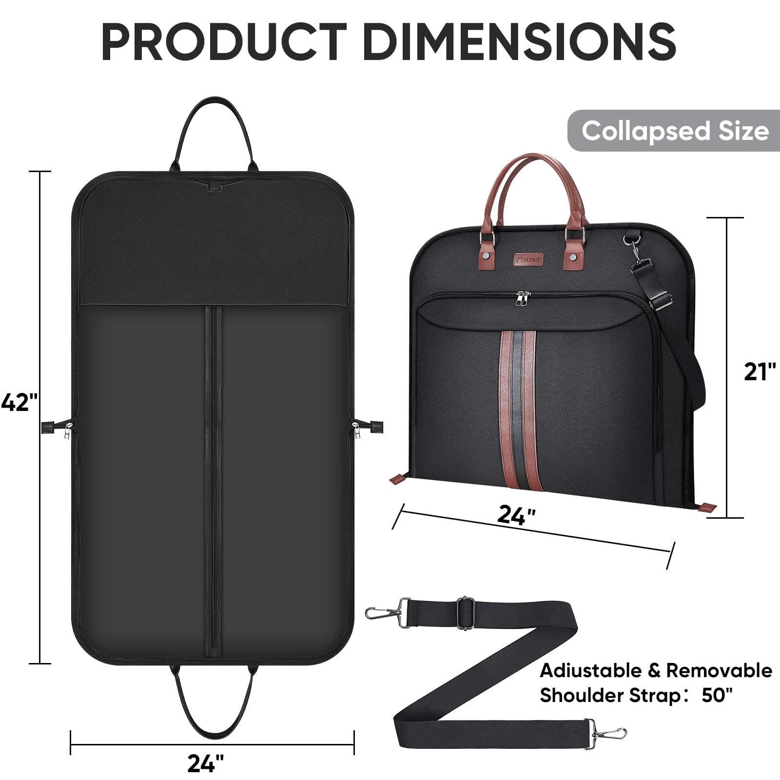 BALEINE Travel Garment Bag, Travel Suit Bag for Men, 42'' Waterproof Carry on Garment Bag for Hanging Clothes, Garment Duffel Bag for Travel Business (Black) Product Details Color: Black Brand: BALEINE MPN: Does not apply UPC: Does not apply EAN: Does not apply Product Dimensions: 42 x 24 x 42 inches Item Weight: 1.63 pounds Department: Unisex Adult Manufacturer: BALEINE Country of Origin: China [Premium Material] Crafted from premium 600D water-resistant materials, this garment bags for storage is a testament to longevity. The structure of the suit carrier garment travel bag ensures your garments remain unharmed from the wear and tear of travel. [Practical Design] This garment bag for suit is more than just a protective layer for your clothes. Its foldable design ensures that it compacts down efficiently, taking minimal storage space. Moreover, you can also store small items in the front pocket of the travel garment bag. The PU handle, complemented by an adjustable shoulder strap, ensures ease of transportation during travels. [Optimized Dimensions] The dimensions of the suit travel bags for men is 42''x24'' when fully expanded, ensuring that your suits, dresses, and precious attire have ample space to rest without getting wrinkled. The dress garment bags for travel gracefully folds down to a compact 24''x21'', making storage or transit a breeze. The adjustable shoulder strap can be extended up to 50'' to suit your carrying preference. [Versatile Utility] Whether you're a business professional headed to a crucial meeting, a groom or bridesmaid preparing for a wedding, or someone attending an upscale event, this suit garment bag is your attire's best friend. It preserves the freshness and crispness, ensuring you always put forth the best version of yourself. [BALEINE Quality Commitment] BALEINE stands behind the quality of our products. If for any reason you are not satisfied with your purchase, please contact us. We provide 30-day money back guarantee. 100% Satisfaction for risk-free shopping!