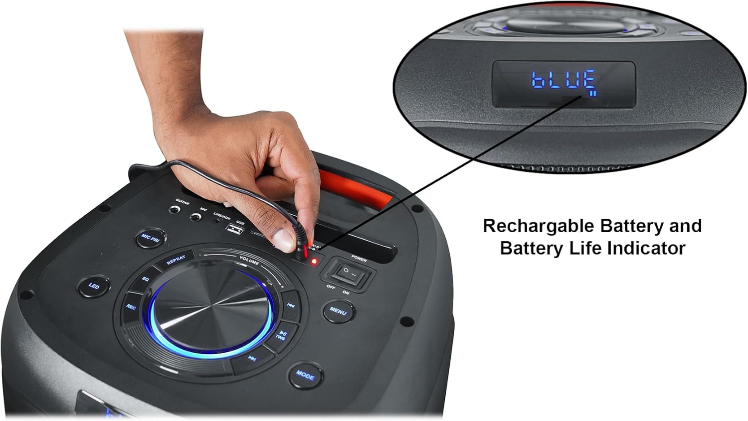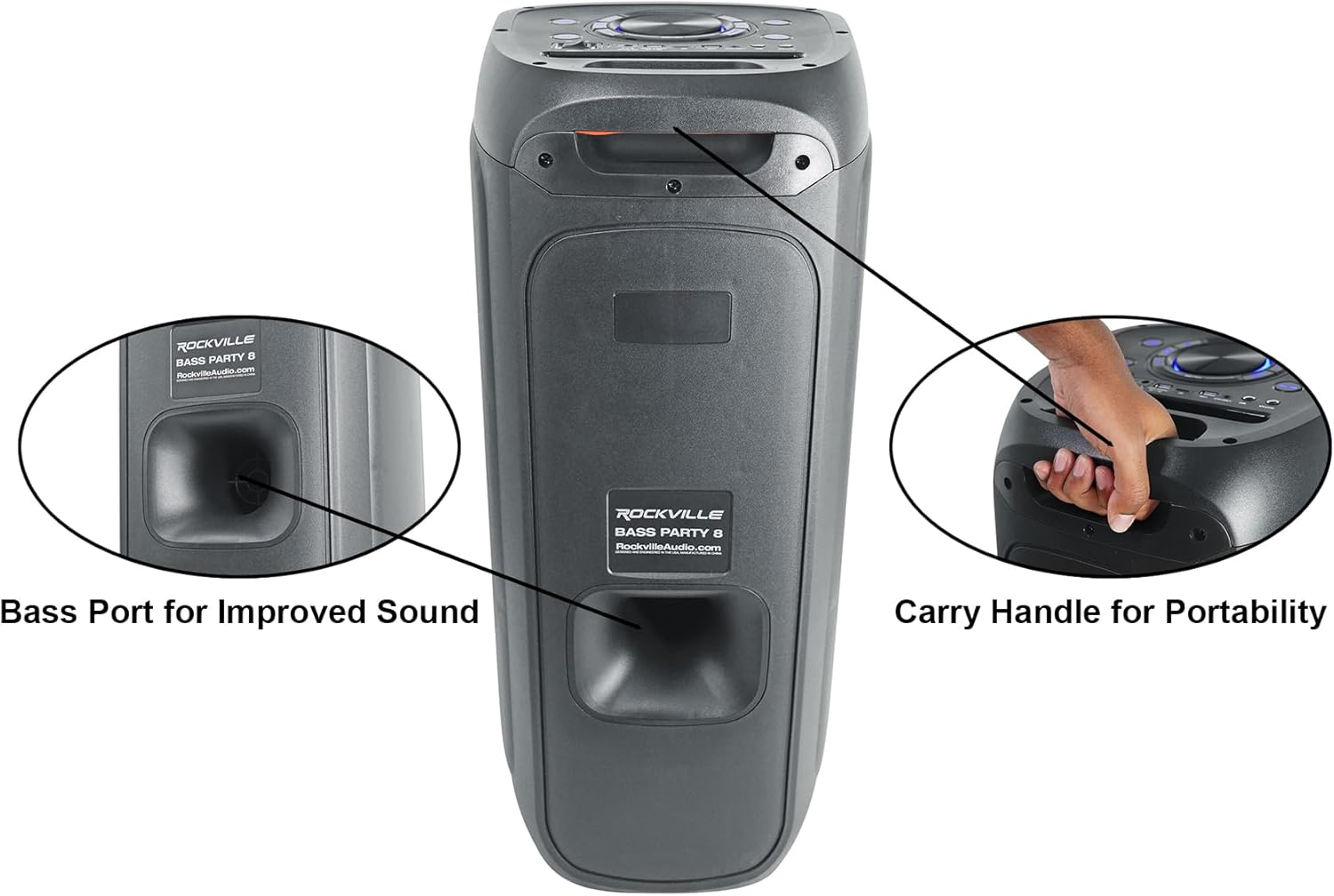 What's in the Box: Dual 8" Powered 2,000 Watt Bluetooth Speaker with 12V, 7AH Rechargeable Battery. Remote control. Power Adapter. Owners manual. Warranty. Rockville BASS PARTY 8 Dual 8" Battery Powered Bluetooth Party Speaker with huge bass! Insanely loud with deep bass (Satisfaction guaranteed or we will send you a pre-paid shipping label and take it back) 8 really cool LED modes that go to the beat of the music. Dual 8" woofers drive this speaker with insane bass (One for bass, and one for mids) (2) 1.5" tweeters for clear highs 2,000 Watts peak / 400w RMS. Bluetooth music streaming with any smartphone, tablet, Alexa device, etc (50 foot long range) TWS - True Wireless Stereo - Wirelessly link 2 speakers. 12V 7 AH Rechargeable battery lasts approximately 10 hours at 20 % volume, 4 hours at 50% volume, and 2.5 hours at 90% volume. Bass and treble control. Built In Bluetooth, USB, SD. Second USB input dedicated to charge your phone or tablet. ¼" mic inputs with level, echo, mic bass, and mic treble controls. ¼" Guitar input with level control. 3.5mm aux input. Large master volume control jog wheel. Perfect for house party's, Home DJ use, tailgating, camping, and many other applications. Built-in handle for increased portability. High-quality Polypropylene and ABS thick enclosure. LED screen displays track info as well as battery life indicator. Rear Subwoofer port for deep pounding bass you feel in your chest. Mic priority function can be turned on or off (When on it lowers the music when talking into the mic) Class D amplifier built in. Frequency Response: 50Hz - 20KHz. Record function. 110/220 Volt Auto-switching power supply with external user serviceable fusing. Product dimensions: 12.8"x 14.49" x 28.74" inches. Weight: 25.13 lbs. The dual 8" party speaker is a big beefy speaker that has the sound and style to rock your next party. This speaker has incredible bass. It sounds like it has a subwoofer built into the speaker. It sounds that way because it does. This is a 3 way speaker box with a 8" subwoofer, a 8" midrange, and a 1.5" tweeter for high frequencies. This is one of the loudest party speakers on the market. The speaker uses digital sound processing technology and it is tuned by Rockville USA to sound balanced and clear with that bass that we know you want. The LED's look really cool. We offer 8 LED modes and you can also turn the LED. If you want to really go crazy, you can buy 2 of these beasts and connect them together wirelessly and really fill a huge space with huge sound. We offer many playback options so you can really get full use out of the speaker. We have a built in high quality Bluetooth 5.0 chip with a 50 foot Bluetooth range. There is also USB and memory card playback built in. There is a mic input for karaoke parties. There is also a guitar input if you want to jam using this speaker. We also added a dedicated USB to charge your phone or tablet. There is also a 3.5MM line input to connect any audio source. There are bass and treble controls to fine-tune the sound for any situation. When you are in party mode you can crank up the bass and shake your house. When you are listening while you are chilling in the backyard, you can fine tune the bass and treble to get the balanced sound you desire.