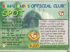 THIS AUCTION IS FOR A BEANIE BABIES TRADING CARD SERIES 2 - SERIES II SPOT THE DOG WITH A SPOT #4000 FEEDBACK Please feel free to ask any questions before bidding I try very hard to be fair and honest and to give you very good customer service and strive for a 5 star rating If you have any problems with any of your items - please contact me before leaving feedback - I will definitely try to make things right THANKS FOR LOOKING AND CONSIDERING MY AUCTIONS - GOOD LUCK! DOMESTIC SHIPPING - SINGLE CARDS AND LOTS UP TO 3 CARDS - MAY BE SHIPPED IN AN ENVELOPE WITH A STAMP OR IN AN EBAY STANDARD ENVELOPE...LARGER LOTS WILL BE SHIPPED WITH TRACKING I AM GLAD TO COMBINE SHIPPING I CANNOT BE RESPONSIBLE FOR LOST OR DAMAGED ITEMS