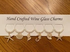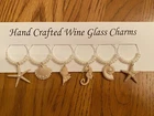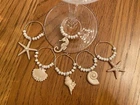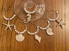 Set of 6 hand crafted assorted"SHELLS" themed wine glass marker charms - Six different SHELL pieces( large starfish w/pearl in center,scallop shell w/3 small pearls,conch shell w/2 pearls,seahorse w/4 pearls, snail shell w/1 lg pearl,med size starfish w/3 sm pearls.)The photos do not do this set justice. This set is very classy with beautiful pearl beads. Comes with white charm card holder and a resealable clear bag.(just remove the staple) I bundle ship so regardless how many charm sets you purchase you never pay more on the shipping Please see my other sets ,just add to your shopping cart before your purchase is complete. CARE: hand wash only, if metal ring starts to tarnish use a jewelry cleaning cloth.