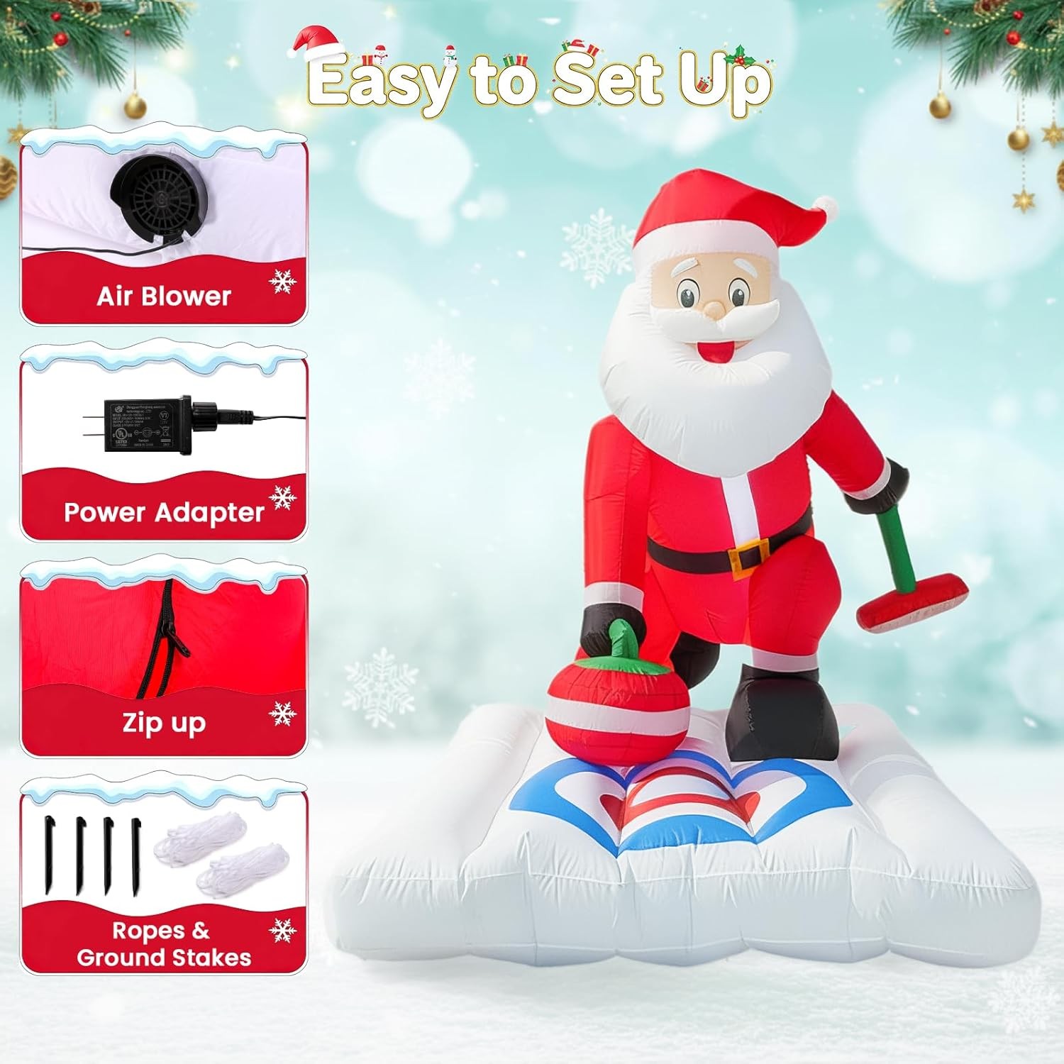 Christmas Inflatable Outdoor Decoration 7Ft x 6Ft Santa Claus Playing Curling with Built-in LED Lights, Blow Up Decorations for Yard Gardern Lawn Xmas Party Indoor Christmas Holiday 【Perfect Christmas Inflatables Decor】: The Santa inflatable playing curling, with a curling stone in hand and a playful grin, bringing a lively and festive vibe to your outdoor Christmas decorations for the yard. Your guests will be charmed by its delightful appearance, making them feel like they are stepping into a cheerful holiday scene. They will absolutely adore it! 【Easy to Set Up】: Simply turn on the built-in fan and watch as this Christmas Santa Claus blow up yard decorations come to life in a matter of minutes. Note: Zip up the bottom and not attempt to inflate this Santa inflatables outdoor decorations during unusually strong wind and raining day. 【Fun Christmas Decor: Inflatable Decorative Accents】: Built from durable, all-weather material, this 7FT inflatable Christmas Santa Claus with LED lights stands strong against wind and rain. It's designed to be a long-lasting part of your holiday tradition, bringing festive cheer to your yard for many seasons to come. 【Versatile Occasions 】Simplify your holiday decorating with our versatile inflatable Christmas Santa.This Christmas blowups perfect for Christmas outdoor and indoor decoration, garden, yard, lawn, patio, living room, which make you stand out in the Christmas holiday. 【The Perfect Addition to Your Holiday Decor】Struggling to find the perfect outdoor Christmas decoration? Look no further! This merry inflatable Christmas Santa is a wonderful addition to your garden and yard. It also doubles as a festive Thanksgiving inflatable, offering fantastic value. It's more than just a decoration—it's a fun gift your child will absolutely love. Order today and get ready to create lasting memories this Christmas!