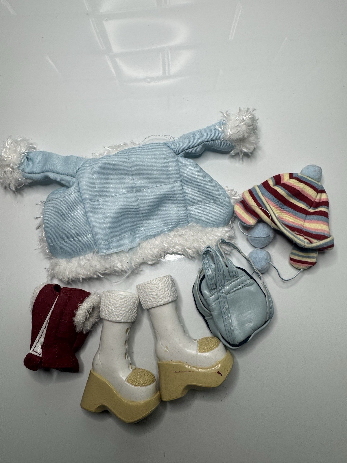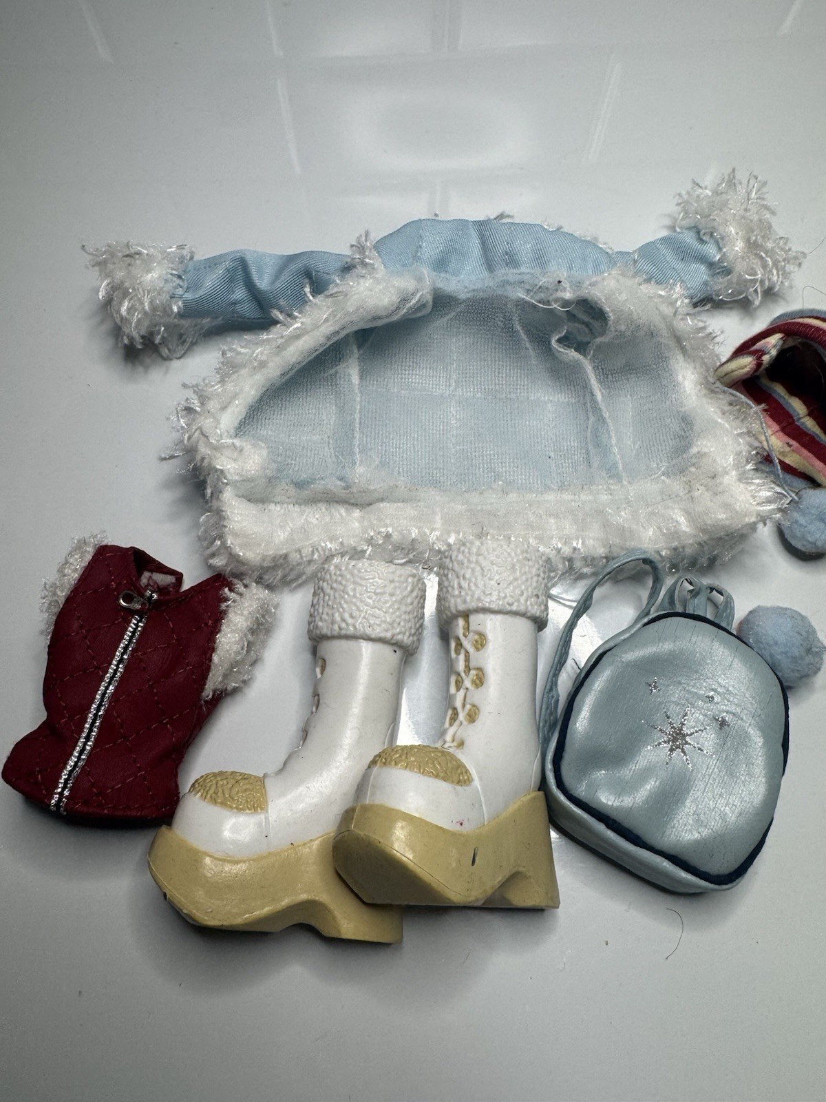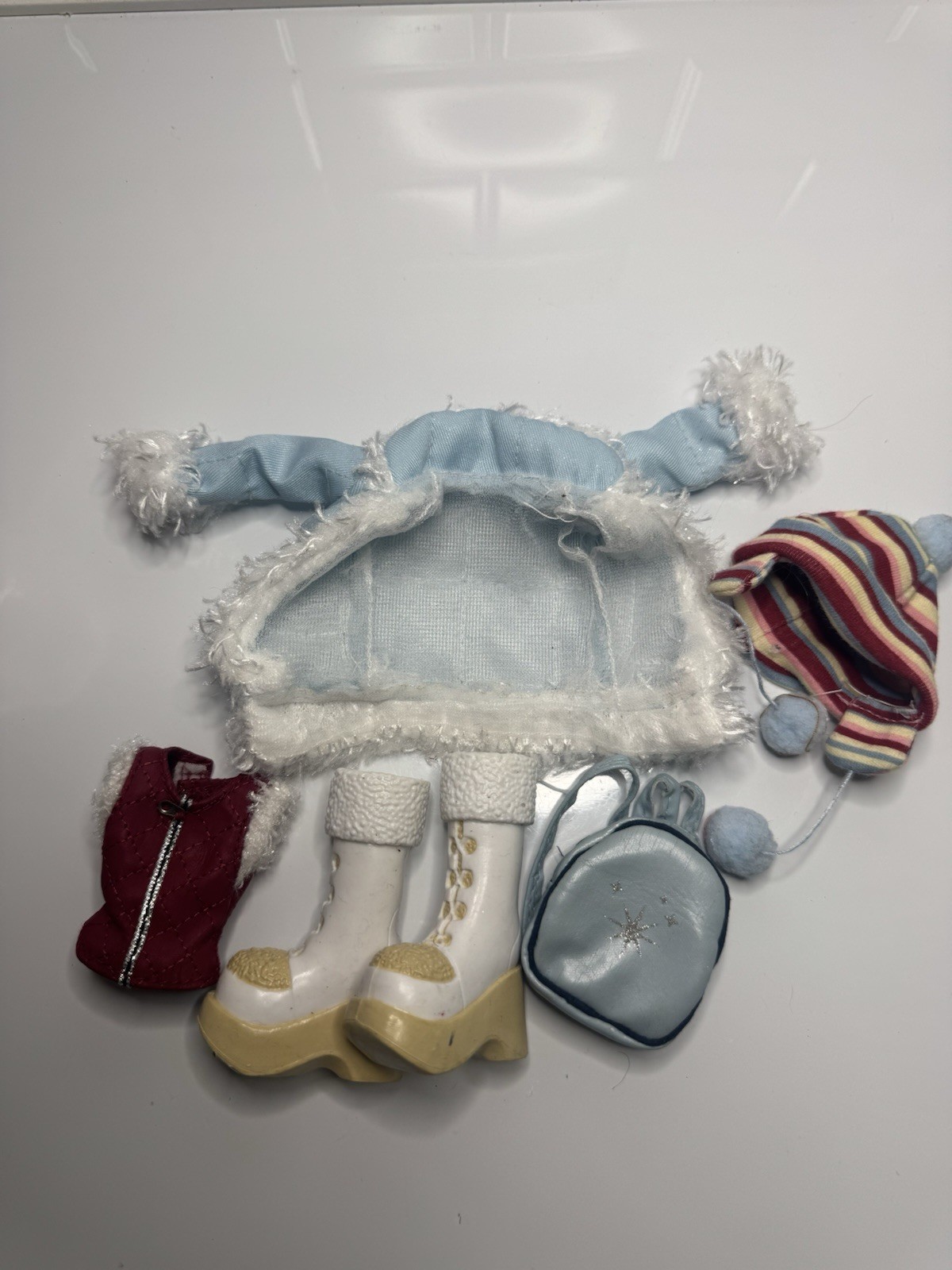 Preowned. MGA Entertainment 2001 BRATZ Winter Wonderland Cloe doll with a few clothes and accessories. Incomplete. Comes with doll, hat, boots, jacket, backpack & shirt. Some markings on the boots. Overall, good condition. Please see photos.