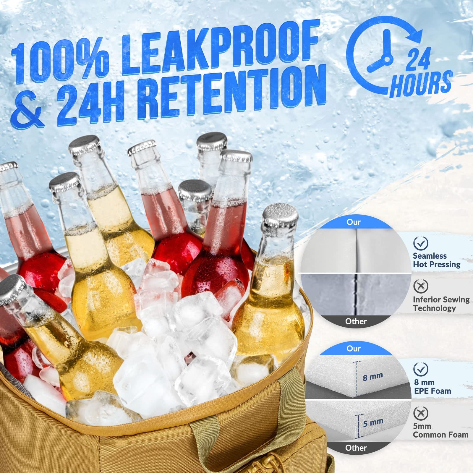 The leakproof tactical cooler backpack is made of high-quality 1000D Oxford fabric and features an external mounting system. The heavy-duty tactical gear has a large main compartment that can hold up to 8.7 gallons of ice or other cold items, as well as side pockets and a top double layer for storing accessories. The rugged backpack keeps contents cool for an extended period, making it an ideal choice for camping, hiking, and other outdoor activities. Outstanding Features of the Military Cooler Backpack: 1. 24-hour insulation and cooling with 5 layers of insulation materials. 2. 100% leak-proof with a seamless PEVA inner lining and waterproof exterior. 3. Large capacity for 45 cans and multi-pocket design with a external hanging system. 4. Comfortable carrying system with widened shoulder straps and breathable sponge design. 5. Convenient and multi-functional with widened handles, beer bottle opener, carabiner, and national flag magic sticker. Specification: Dimension:44*29*26cm/17.3*11.4*10.2in Storage:33L/8.7gal Color: Black, Khaki Package: 1* Cooler Backpack 1* National flag magic sticker 1* Carabiner 1* Bottle opener 24-hour Insulation and 100% Leak-proof --- The backpack cooler with cooler compartment is made of 5 layers of insulated materials, and 8mm high-density insulation pearl cotton provides excellent insulation and cooling effects for the backpack. The insulation lasts for up to 24 hours, making it suitable for short camping trips. The inner liner of the cooler backpack is made of PEVA material, combined with seamless hot pressing technology, making it easy to clean and leak-proof. Tactical Backpack Design --- The cooler backpack adopts a tactical backpack design, with an external mounting system for attaching additional equipment such as sunglasses, towels, picnic mats, and clothes. 2 Carrying Handles --- The soft cooler is equipped with two carrying handles, one on the front and one on the back. With the two carrying handles, you can easily move the backpack around and adjust its position according to your needs. Large Capacity of 45 cans and Multi-pocket --- The heavy-duty insulated backpack cooler has a capacity of 8.7 gallons (33 Liters), with dimensions of 17.3*11.4*10.2in, which can hold 45 cans of 11oz drinks and 2 bottles of wine. The portable beach cooler adopts a dry and wet separation design, with the main layer for storing drinks, ice cubes and other items, the top compartment for snacks and personal items, the front pocket for cutlery, and the side pockets for 2 wine bottles or water bottles. Durable Oxford Cloth --- The leak proof lunch cooler is made from 1000D Oxford cloth, which is a type of heavy-duty fabric that is known for its durability and wear-resistance. This material is particularly suitable for outdoor activities and environments, as it can withstand the elements and rough handling. Comfortable Carrying System --- The widened shoulder straps have stronger bearing capacity, and the breathable sponge on the shoulder straps and back makes the carrying more comfortable and breathable. The design of the chest and waist belt buckles makes it easier to carry and reduces the pressure on the shoulders. Multi-functional --- We provide 1 beer bottle opener, 1 climbing buckle, and 1 national flag magic tape. The front of the bottle opener can be used to open beers, and the back can be used to open beverage cans, making it convenient and practical. The large insulated cooler bag is suitable for beaches, picnics, hiking, fishing, camping, traveling, or other outdoor activities.