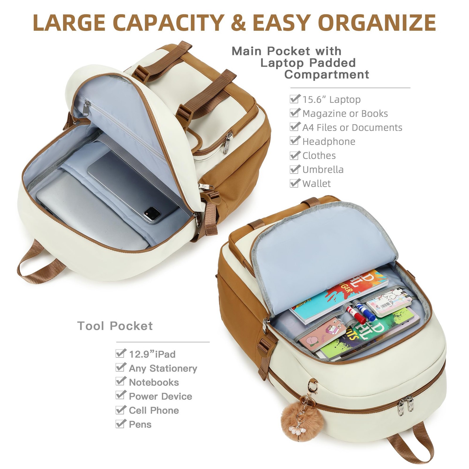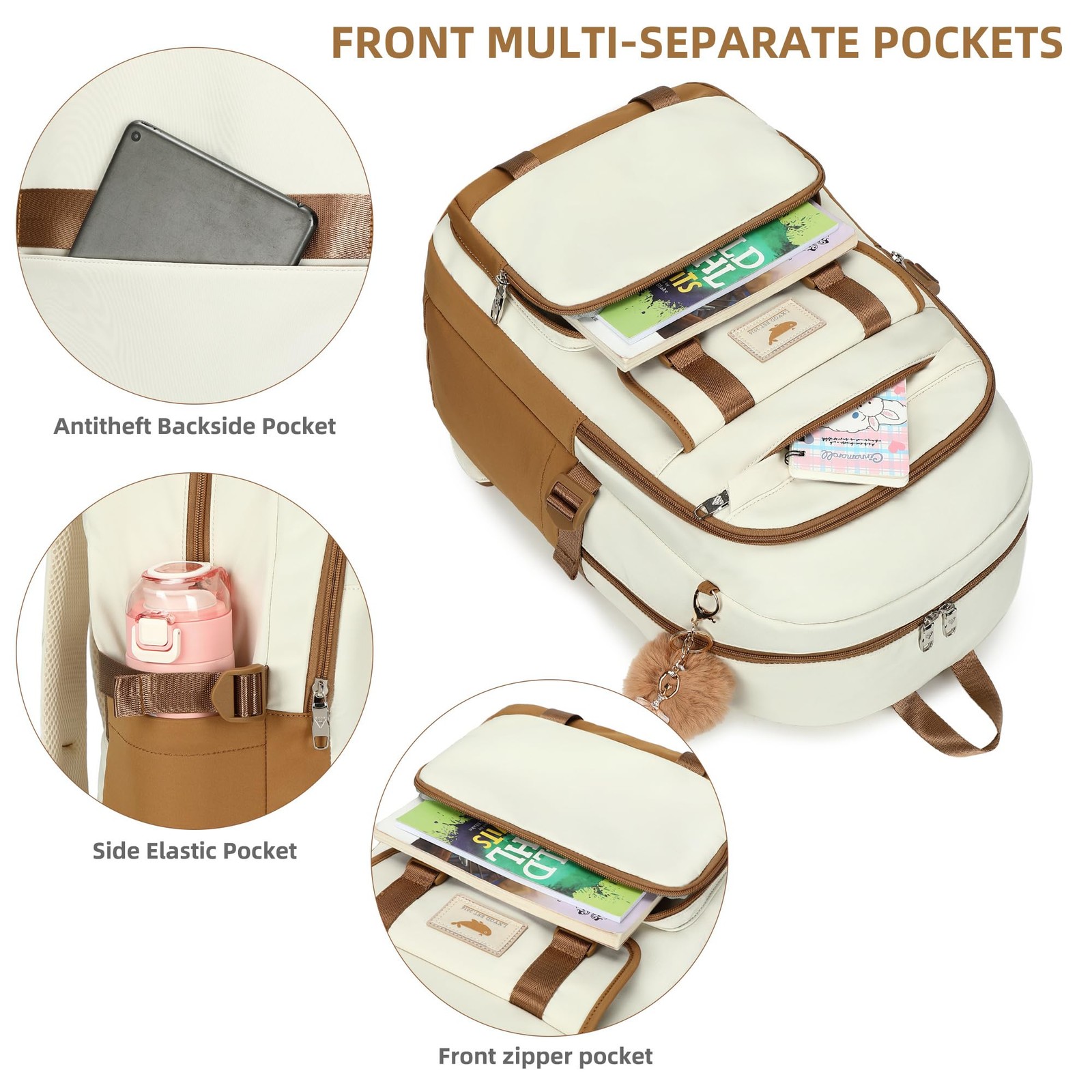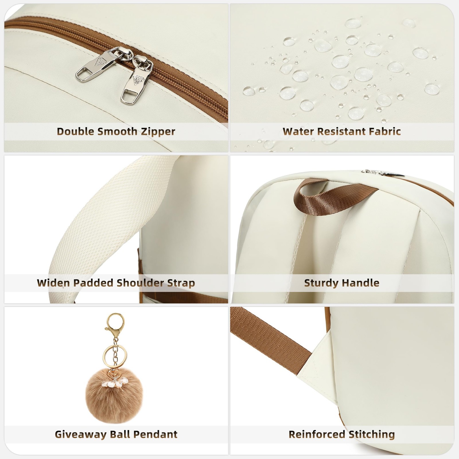 【Large Size & Gift】: The size of back pack is 17.8"x12.5"x7.5"(H*L*W), Weight:1.65 LB. The laptops bag with padded compartment sleeve fit for 13.3,14,16 inch tablet. This women book bag also along with fluffy ball key pendant as gift makes the bags more fashionable and unique 【Waterproof Material &Smooth Zipper】: The middle high school campus backpack is made of waterproof, ultra-lightweight, high density nylon fabric and cute printing polyester lining. The metal zippers closure are used by the premium quality zippers to ensure the long-lasting usage 【Convenient & Comfortable 】: The considerate belt on the both side can create a solid base of support if you’re packing a lot of stuffs on the knapsack. The Widen and thicken durable S-shape straps is well-padded, adjustable and comfortable to carry. The luggage belt on the back of bagsack can be fitted on luggage/suitcase to make your travel more convenience. 【Multi-compartments & Large Capacity 】: The travel backpack for women has 7 separate different compartments and two side elastic pockets. The main compartment of includes laptop padded sleeve with elastic belt. The front tool compartment also come with multiple pockets to provide roomy space for necessities . The back zipper pocket can protect your important items from theft. 【For Any Ages & Occasion】 The lightweight backpacking purse is stylish enough for casual and student use, while the design provides the multi functionality. Backpack perfect for young teens, girls, ladies. The basic multipurpose daypacks for most of your needs, easy to match your cloths, suitable for short trip, travelling,work, shopping, university, elementary school, etc