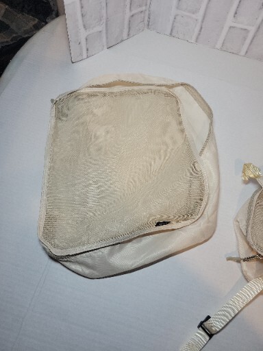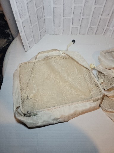 There is seven different size bags. There's a small makeup bag there is a shoe bag there are a toiletry bag with a handle that could be hung onto a door or hook the other bags have Clips to clip in your clothes for security all with zippers