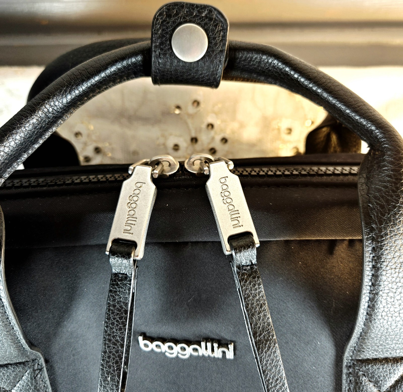 The Baggallini Soho Backpack Tote Laptop Travel Bag in black nylon is a medium-sized rectangular bag with a zip closures and a top handle design. Suitable for everyday travels, this versatile backpack features inner pockets, lightweight construction, RFID blocking technology, and water-resistant exterior material. The black nylon exterior with silver hardware accents and a solid pattern make it a stylish and functional choice for women on the go. With adjustable straps and inner dividers, this Baggallini backpack from the Soho collection offers both practicality and a sleek design. M104