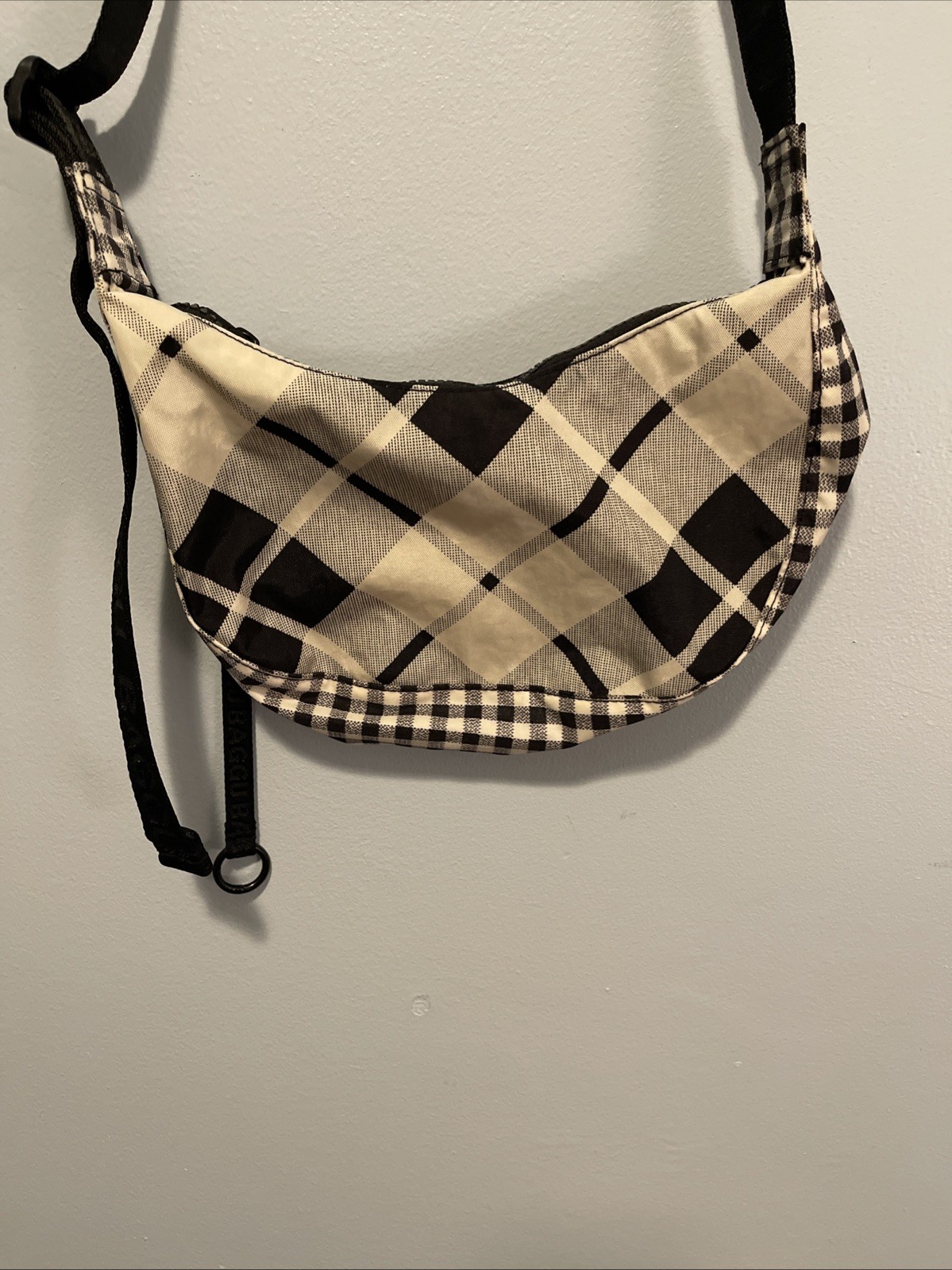 The Baggu Cross Body Bag Purse is a medium-sized nylon bag with a solid black exterior and matte finish. It features a zip closure, black nylon crossbody strap, and plastic hardware accents. Perfect for crossbody wear, this purse is adjustable in size and is ideal for everyday use. The sleek design and durable materials make it a practical and stylish accessory for women on the go.