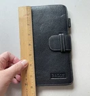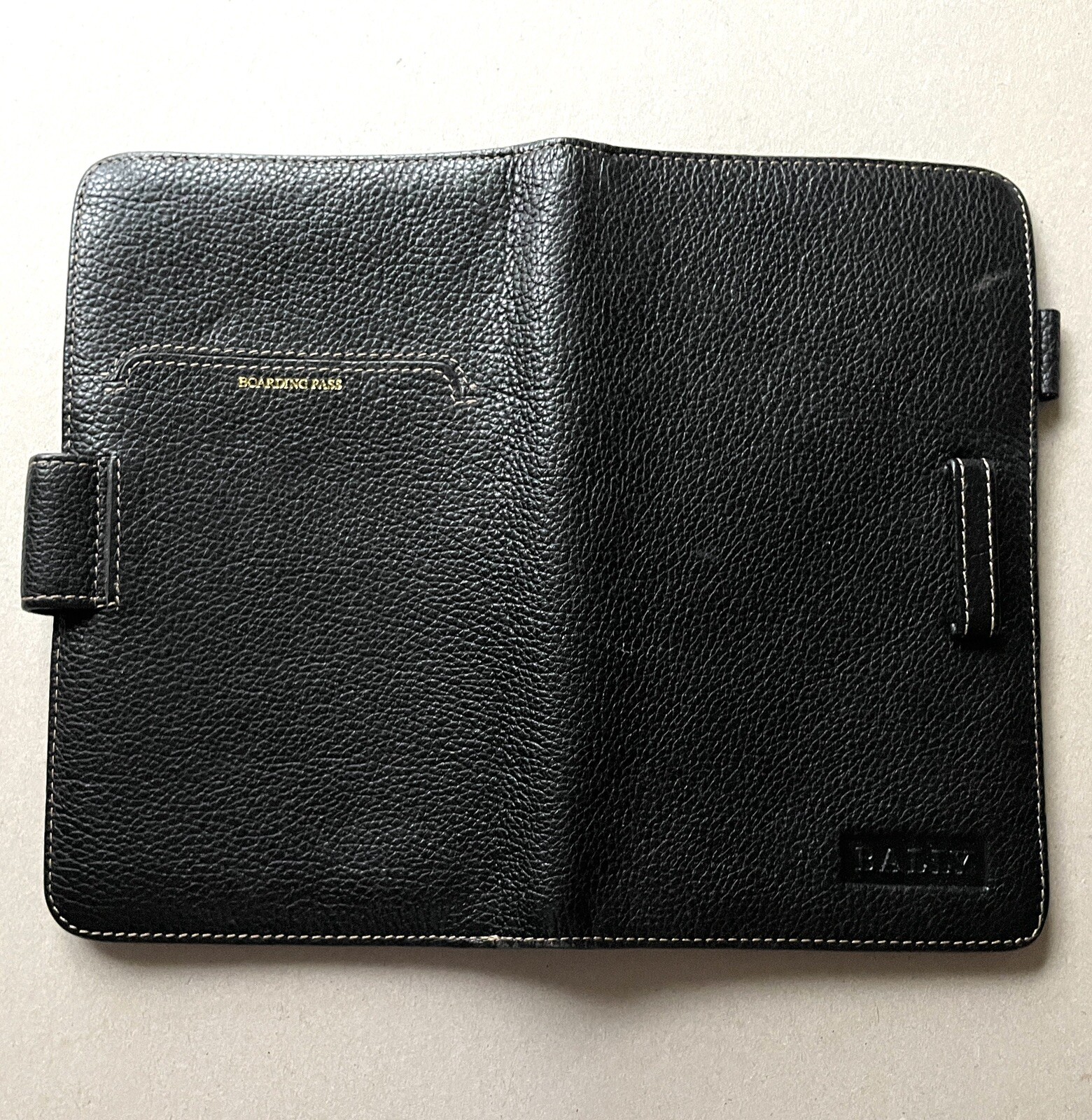 bally Vintage learher passport holder. Vintage authentic leather Bally Passport Holder/Wallet Black Pebbled Genuine Leather Embossed Bally Logo Tab Closure Bally logo lining Very Good pre owned Condition. Leather is great with minor scuffs Some black staining on the clear plastic pockets inside (see photos) Slots for: Credit Cards, Currency, Air Ticket, Passport, Business Cards, & Boarding Pass Pen holder (no pen included) See photos for a more accurate description & measurements From a smoke/pet free home.