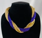 This is a Bangle Bangle by Amrita Singh purple and gold tone twist chain choker necklace. If you need more pictures or descriptions please let me know before purchase. I will combine shipping. Pictures are taken inside a light box, colors may vary based on lighting. Unless specified as new, my items are used, vintage or antique and will have imperfections given use and age. I do my best to describe and photograph problems but it is possible I might unintentionally miss something. Please contact me if you have a question or concern, I will respond promptly. My items are as is.