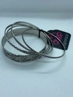 Varying in textures, mismatched silver bangles join a thick silver bangle engraved in the words, "love" around the wrist for a flirtatiously casual look. Sold as one set of five bracelets.