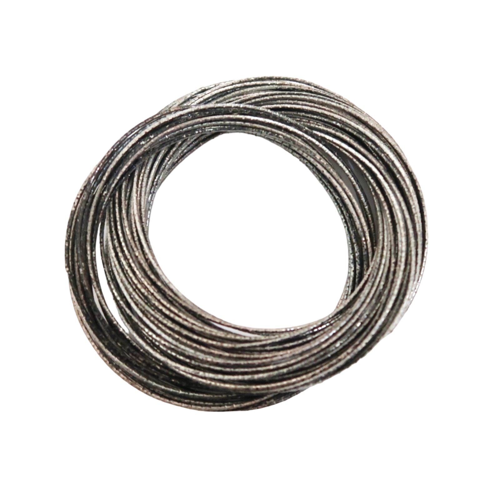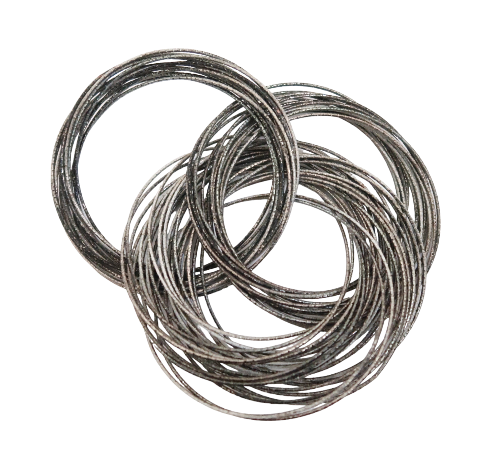 Set of 58 intertwined sparkly metal bangle bracelets, colored gunmetal, silver and gray. The combined width is approx 3/4". Inner diameter all together is approx 2 1/2". Very good condition.
