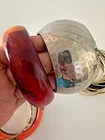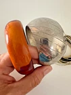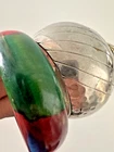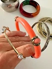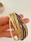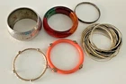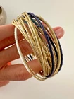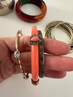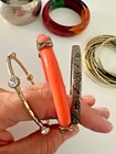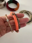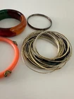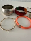 One is multi colored wood, one is multi bangles in gold tone and blue wrapped thread, one orange resin with gold tone detail, a hammered silver tone wide bangle, one flowered silver tone bangle, and one with rhinestone detail One lot of 6