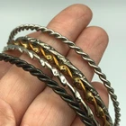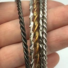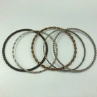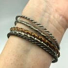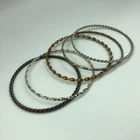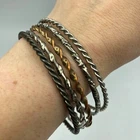 This is a secondhand set of bangles. There are 4 bangles in total, made from metal, in a mix of colours and finishes. This set is used in good condition with some minor signs of wear/tarnish. This is an adult's size set .