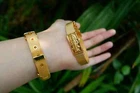 Bangle Wessuwan Giant God Bracelet Watchband Gold Plated Thai Buddha Amulet Description Amulet : Bangle Wessuwan Giant God Gold Plated Watchband Temple : Thailand Material : Alloy Size : Adjustable Condition : good condition Life protection, Avoid from danger, Wealth, Prevent Dark Magic and Evil Spirits, Attraction money and lucky, Danger Obstacle cease, Give metta merciful, Triumphantly, Harm proof, Weapon proof, Loving Kindness, Change Bad Luck to Good Luck, Bring Lucky and Happiness, Wishes be Fulfilled, Bring Prosper to Business, Invulnerable, Successful, Good Trade, Halo, Powerful. Guaranty genuine amulet. . Visit my eBay Store : Mantra amulets free Tracking number. Before wearing amulets, please do this way : - Make your mind calm, think of all your goodness you have done, and focus all your faith to the Buddha - Put your amulets onto your hands, join your hands together - Breathe in deeply and slowly -Then chant 3 times of this initial Mantra: NAMO TASSA PHAKHAWATO ARAHATO SAMMA SAMBUDH TASSA The chanting verse means we are now praying respect to the Lord Buddha who has done the great goodness. Then request with your own language for his help, say "I, a humble one, invite the Lord Buddha and Luang Phor..... [name(s)] to sit on my head to protect me all day long and bring me a good luck, a victory, and a fulfilment of all my wishes." Then say " BudDhang PraSitThiMae DhamMang PraSitThiMae Sangkhang PraSitThiMae." The meaning of this Mantra is-may Lord Buddha, Dhamma and Sangkha or Triple Gems bless all my request successful. And then wear the chain of amulets onto your neck. What do we have to do if we want to take the chain of amulets out off our neck? Just take it out off your neck and put all amulets in your hands. Join your hands together, say thanks to the Lord and Luang Phor(s) that protect us and let us come back home safely. Then bring them onto a high place. Any restriction when wearing Thai Buddhistic amulets? Yes, there are some restrictions: -Don't bring amulets with you when you go to the low and improper place ... .. -Don't go underneath the improper things such as the lady's skirt or someone's shoes, except you are on the inevitably compulsory environment such as going under a bridge or working in a skyscraper, etc. Is it true that the Buddha amulet can protect firearms? Yes it is. But it also depends on the quality of your mind. The late Luang Phor Ngern of Wat Don Yai Hom, Nakorn Pathom Province, one of the greatest guru monks, once said that: the number-one mind with full-hearted trust in Lord Buddha's miracles, the gun will not bang or misfire; the number-two mind, the gun bang but the bullet misses; the number-three mind, the gun bang and the bullet hit the target but never penetrate into the body. So, when you hang Buddha amulets on your neck, you must have faith and trust on the Buddha!! The Buddha power in an amulet depend on: 1. Who creates it? If the amulet is created by the great guru monk who has Samatha and Wipassana Yana ( the great knowledge on advanced meditation), he could invite Lord Buddha of every epoch and all Arahants to charged the great power onto the amulet. 2. How clean and how good-intended on that creation. In the old times, almost all guru monks had very clean and good-intended mind because they aimed at the future-to-be Buddha, so they devoted their lives to help build a lot of facilities in many temples. That means tons of money are needed to buy raw materials for construction, so amulets were created to present to donors as a gift in exchange. The good examples on this are Luang Phor Doem of Wat Nong Pho and Luang Phor Parn of Wat BangNomKho, both Luang Phors helped build more than 30 temples!! At present times, we still have very good guru monks but not as many as in the past. So, if you would like to collect the newly-made amulets, you should have to ask yourself with some of these questions: who create them and do they have advanced meditation knowledge, what for, and who are invited to perform the blessing ritual, etc. . Visit my eBay Store : Mantra amulets PAYMENT : - Payment managed by eBay. - Payment is due within 3 days after the end of auction. - Please contact me before leaving a negative feedback, giving me a chance to resolve your problem. - Your satisfaction is my goal. If you're not satisfied with the item you purchased, please contact me before leaving a feedback SHIPPING & HANDLING : - Shipping via Air Mail package. - Product will be shipped from Thailand - I use global air mail delivery service. Item will be shipped within 2 business days after receivied your payment. - I can combine shipping for multiple items into one parcel and none extra shipping cost. - Delivery Time America, Europe 2-4 Week / Asia & Australia 1-2 Week RETURN & CLAIME : After receiving an item.If you are unsatisfied you may return the item for a full refund within 15 days. If the factory seal has not been broken and the item has not been installed. Any product that has been modified by the customers once they have received it is non returnable. All items must be returned in original condition. The refund will be in the same as the purchase was made Thank you very much. กำไลท้าวเวส