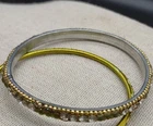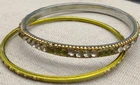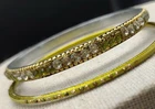 Add a touch of ethnic glamour to your wedding outfit with this beautiful 2-piece bangle bracelet set from India. The slip-on closure and stackable design make it easy to wear and perfect for any occasion. The lime green round stones are set in a channel style with gold enamel finish, adding a pop of color to your look. These handmade bangles have an antique feel and a vintage look, making them a unique addition to any jewelry collection. The bangles are made of alloy with unknown metal purity.