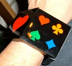 massive bangle bracelet with colored suits for playing cards from Paris designer Marion Godart poker bridge canasta fans diamonds spades clubs and hearts it is super thick and chunky black pyramid discs , 2 in squared 5 discs stretches to fit your wrist very heavy for the size excellent condition from my personal stash of wow jewelry for the card player in your life please check my other listings for more fun stuff. Please note: Although items listed here may have been 'Previously Enjoyed', I take great care to assure they are as described and in stated condition. Please e-mail any questions On Oct-23-09 at 15:34:20 PDT, seller added the following information: International Buyers – Please Note: * Import duties, taxes and charges are not included in the item price or shipping charges. These charges are the buyer's responsibility. * Please check with your country's customs office to determine what these additional costs will be prior to bidding/buying. please note i sell vintage jewelry, excellent vintage condition does not mean a new out of the box piece please ask questions as all sales are final