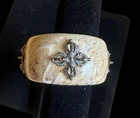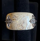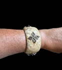 Add a touch of spirituality to your wardrobe with this beautiful bangle bracelet. The bracelet features a unique Buddhist spiritual symbol that adds an elegant touch to any outfit. The bangle is made of high-quality lucite or plastic material, ensuring durability and long-lasting use. This bracelet is perfect for any occasion, whether it's a formal event or a casual day out. The slide closure makes it easy to wear and take off, while the yellow and brass color combination adds a touch of sophistication to the overall design. The yellowed marble like bangle is either Lucite or plastic, I cannot determine it. The opening on it is 2 1/2 “ and the thickness of the bangle is 1 1/2” . The accents on this piece are brass Nepal D ouble Dorje Tiberian Buddhist S piritual S ymbols . Whether you're looking for a statement piece or simply want to add some spirituality to your jewelry collection, this bangle bracelet is the perfect choice. This has been kept in a smoke and pet free environment TERMS: - returns accepted within five days of receiving item - ships to Continental US only