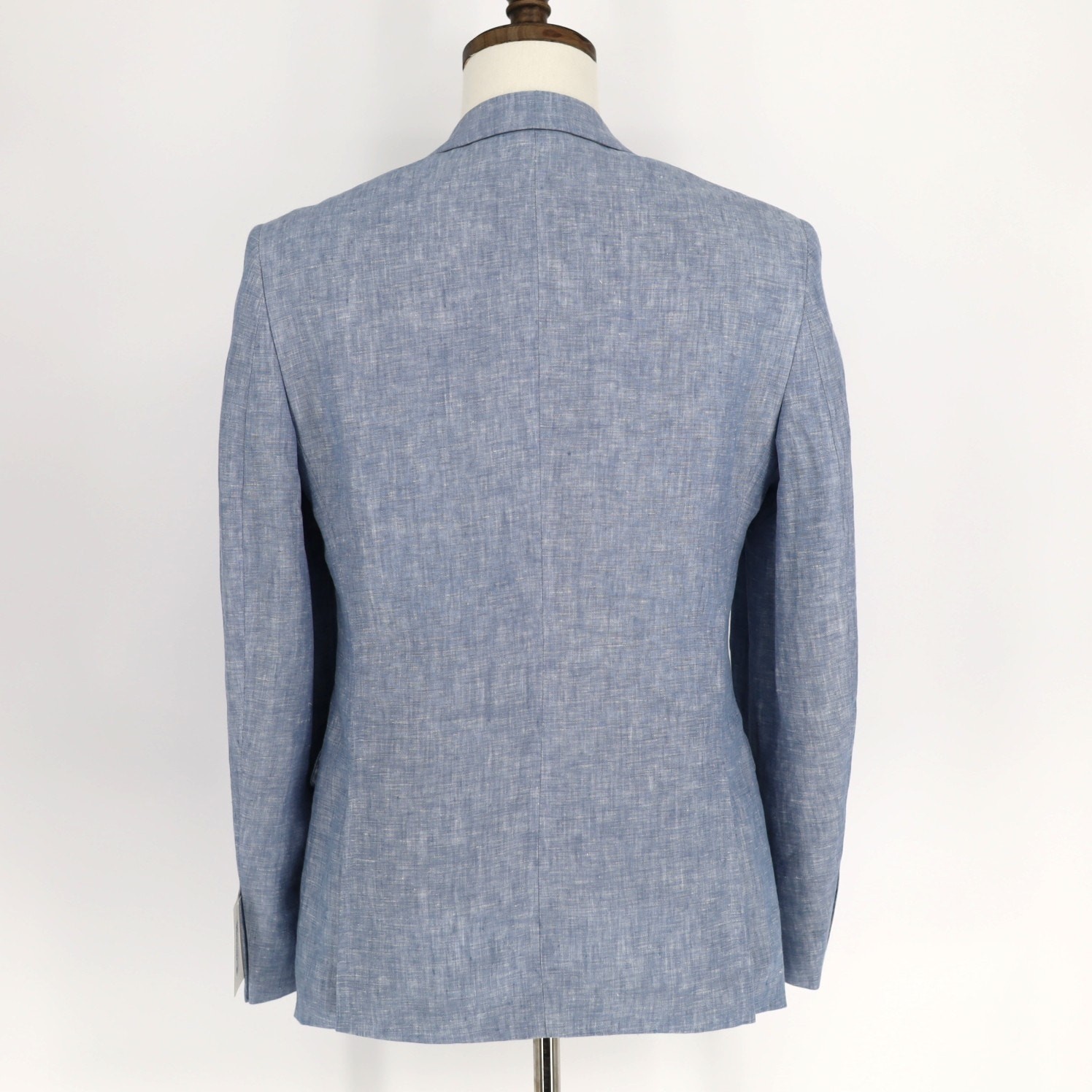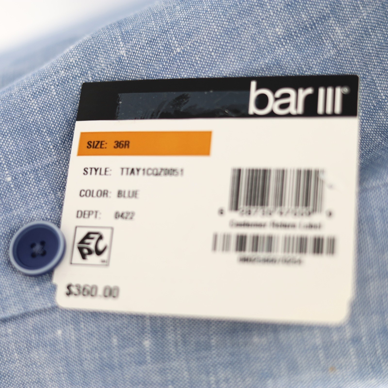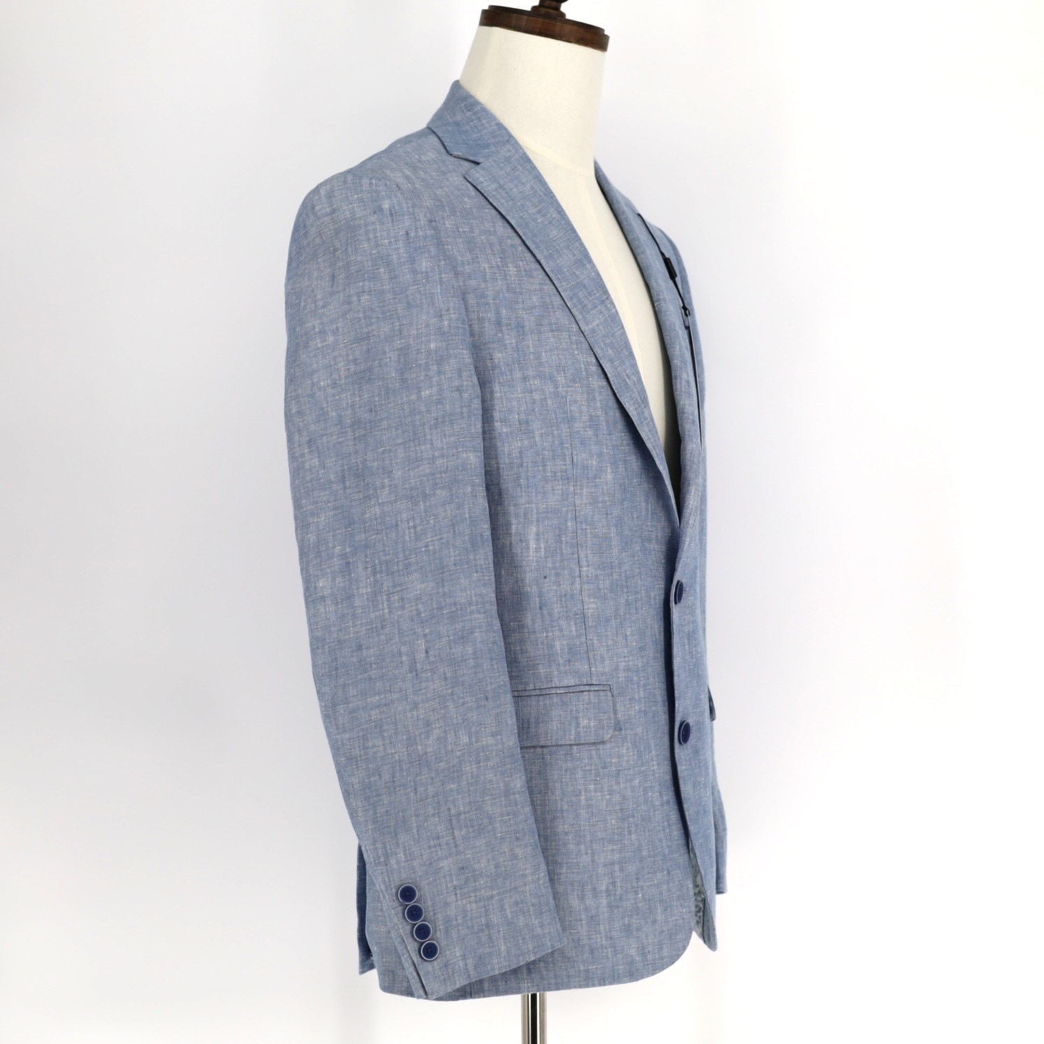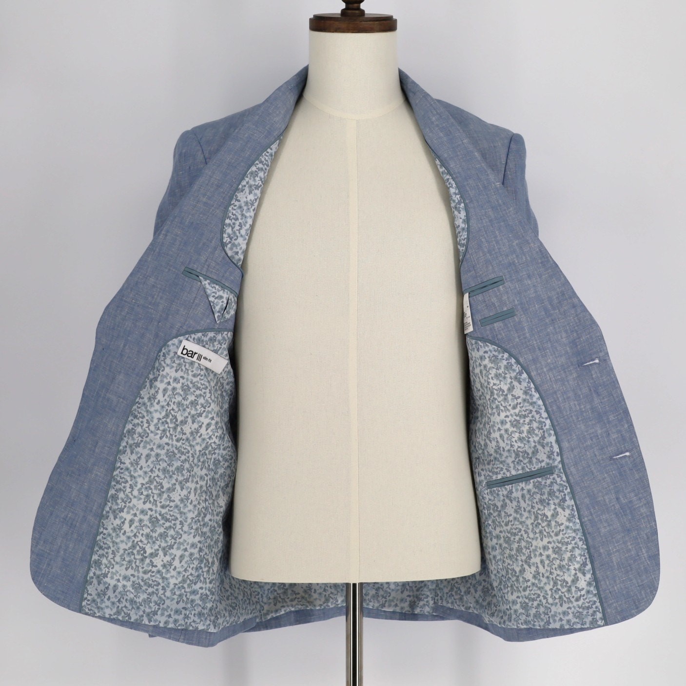 Bar III Men's Light Blue Linen Summer Casual Slim Formal Suit Jacket Size 36R New with tags MSRP $360 Slim fit - narrower point-to-point shoulder measurement, higher armholes Notched lapel Two-button closure Four-button cuffs Two front flap pockets Left chest welt pocket Internal pockets Side vents Jacket is fully lined 100% linen Lining: 100% polyester Dry clean Length 30" Armpit to armpit 18" Sleeve 25.5" Shoulders 17.5"