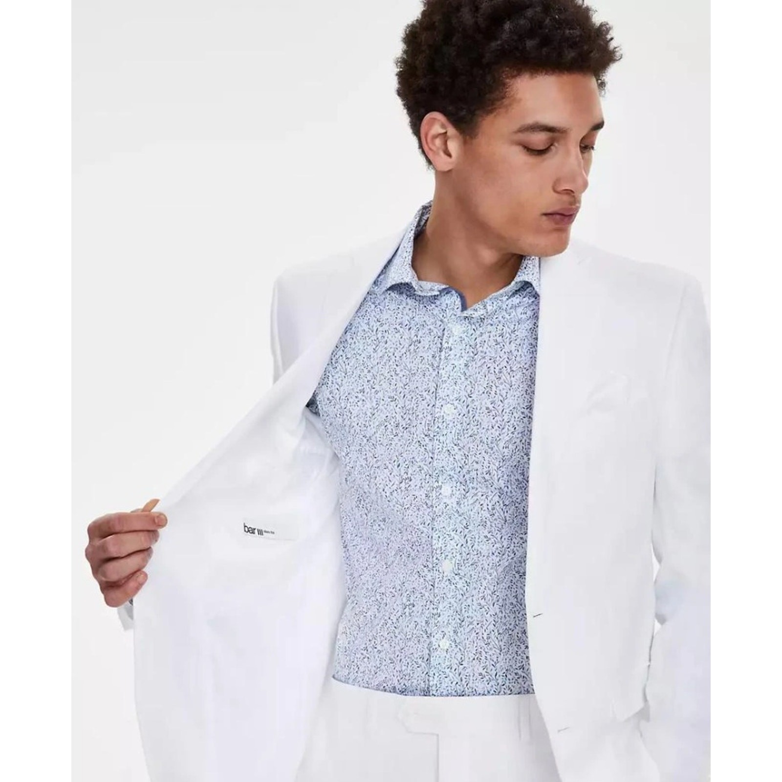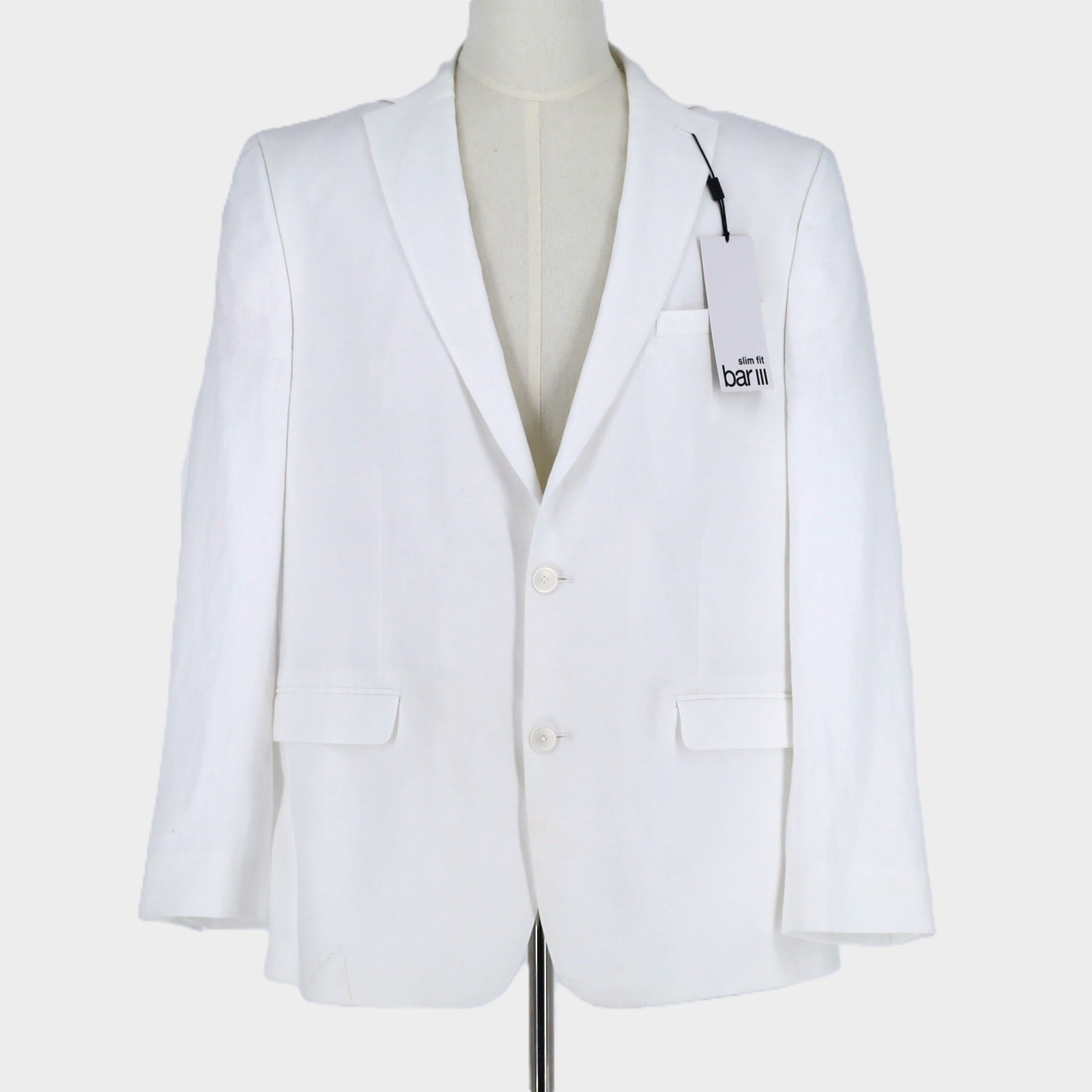 Bar III Men's White Textured Linen Summer Casual Slim-Fit Suit Jacket Size 38S New with tags MSRP $360 Slim fit - narrower point-to-point shoulder measurement, higher armholes Notched lapel Two-button closure Four-button cuffs Two front flap pockets L; left chest welt pocket Internal pockets Side vents Jacket is fully lined 100% linen Lining: 100% polyester Dry clean Length 30" Armpit to armpit 21" Sleeve 25" Shoulders 18.5"