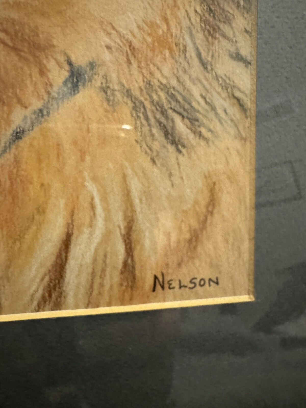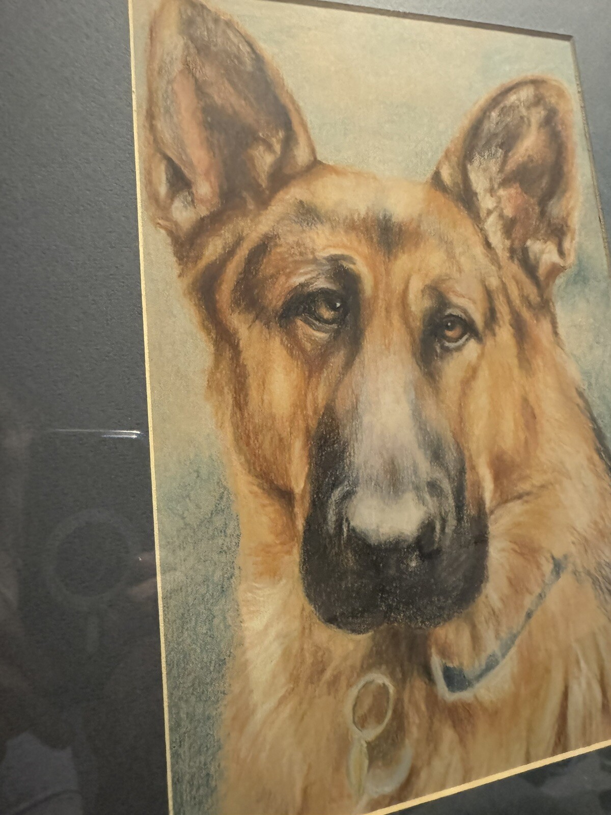 This beautiful piece is an original drawing by Barbara Nelson, featuring a noble German Shepherd in colored pencil. It has been professionally matted and framed, making it a perfect addition to any art collection. The artist's signature adds a personal touch to the piece, making it truly one-of-a-kind. Measuring 18 1/8" in height and 14 1/8" in width, this handmade drawing showcases Nelson's realistic style. The attention to detail in the fur and facial features of the German Shepherd make it a stunning representation of this beloved breed. Whether you're a dog lover or an art enthusiast, this original piece is sure to impress. This is Titled Julie’s Dog. Comes in a Gold Tone Frame. PLEASE SEE PICTURES - THERE IS A WRINKLE IN THE MAT AT THE BOTTOM. Originally priced at $135 by the artist this is a complete bargain at $44.95
