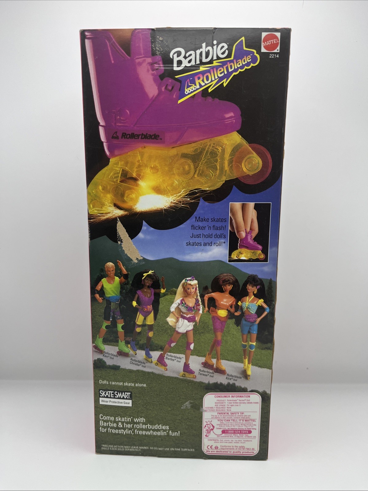 The Barbie Rollerblade 2214 Doll from 1991 features a multicolor design and comes with a pair of roller skate flicker 'n flash skates. This vintage Barbie doll is a fashion doll that includes the doll, rollerblades, hair brush and elbow pads. The Barbie brand is known for its quality and attention to detail, making this collectible doll a must-have for any Barbie enthusiast or collector of vintage dolls.