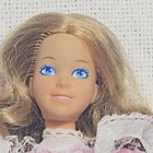 This is a vintage 1979 Barbie Heart Family Mom doll by Mattel. The doll is 11 inches tall with curly light brown hair and blue eyes. She has bendable limbs and comes with removable clothes, an outfit, jewelry, and is made of cloth, plastic, and rubber. The doll represents a Caucasian adult woman and is part of the Heart Family product line. Made in China, this original Barbie doll is a collectible piece from the 1970s.
