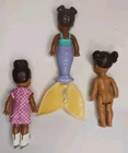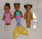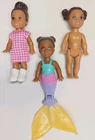 This is a lot of three Barbie Kelly dolls from Mattel, including a mermaid, an ice skater, and a vintage 1994 doll. The dolls vary in hair color, eye color, and complexion and are made of cloth and plastic materials. They are 4 inches in size and gender-neutral, suitable for all occasions. The set includes the dolls only, without packaging, and is part of the Career Barbie product line, with themes like school and featuring characters like Barbie and Kelly.