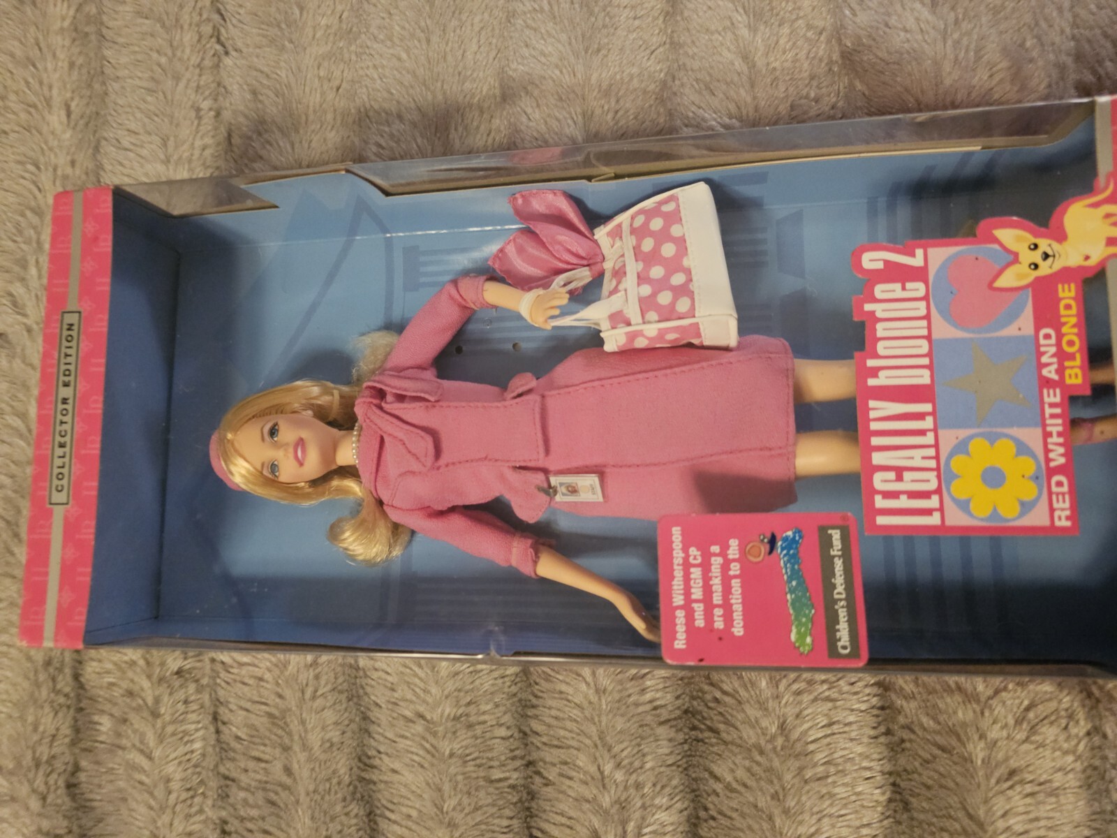 This is a Barbie Collector Edition doll from 2003, featuring Elle Woods from Legally Blonde 2. The doll has blonde hair and comes with accessories. This Barbie doll is part of the Barbie Collector product line and is an original licensed reproduction. Box in great shape!
