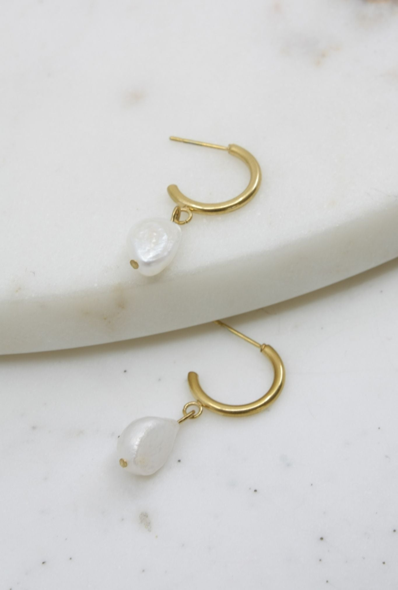 A Blonde and Her Bag Hoop Earrings with Baroque Pearl Drop Elegant hoop earrings with a pearl drop. Available in gold. Metal Type: Stainless Steel Size: 1" with 7mm pearl Click the links below to discover more: Metal Types Stone Meanings